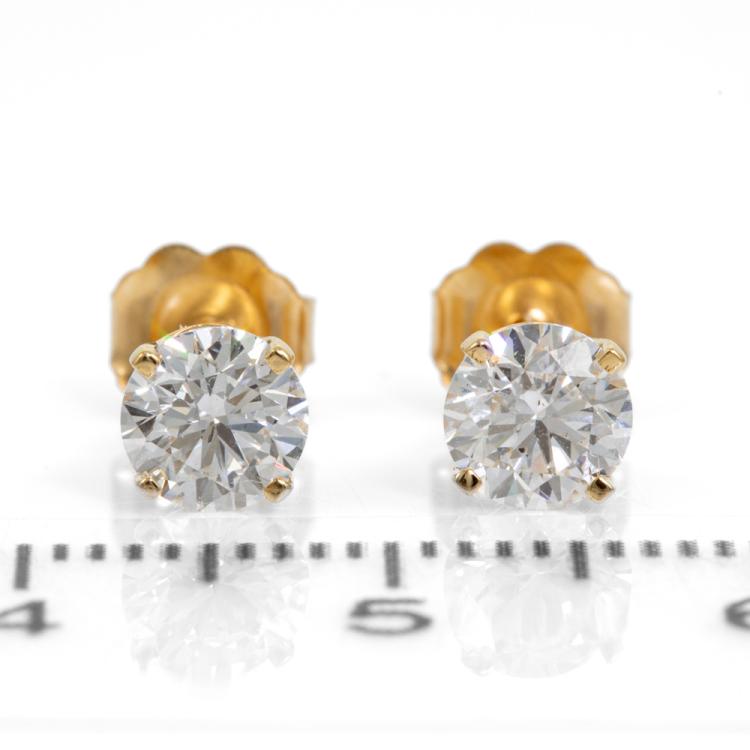 Diamond Studs with 2 round brilliant cut natural Diamonds totalling 1.09cts (with GIA Summary reports graded D SI1 #5486697012, 5433557613). 18ct yellow Weight 1.3g (New)