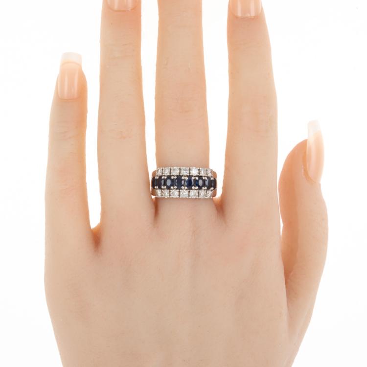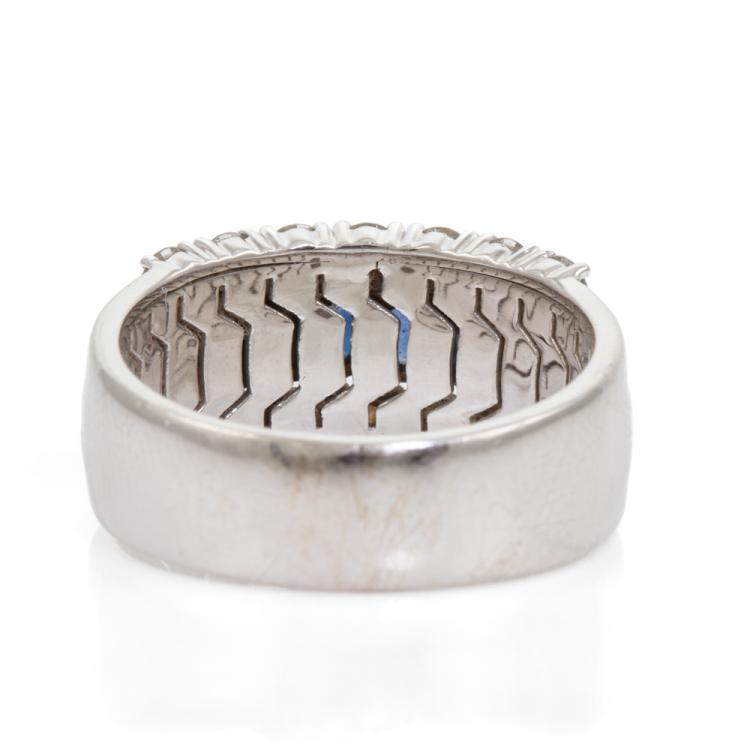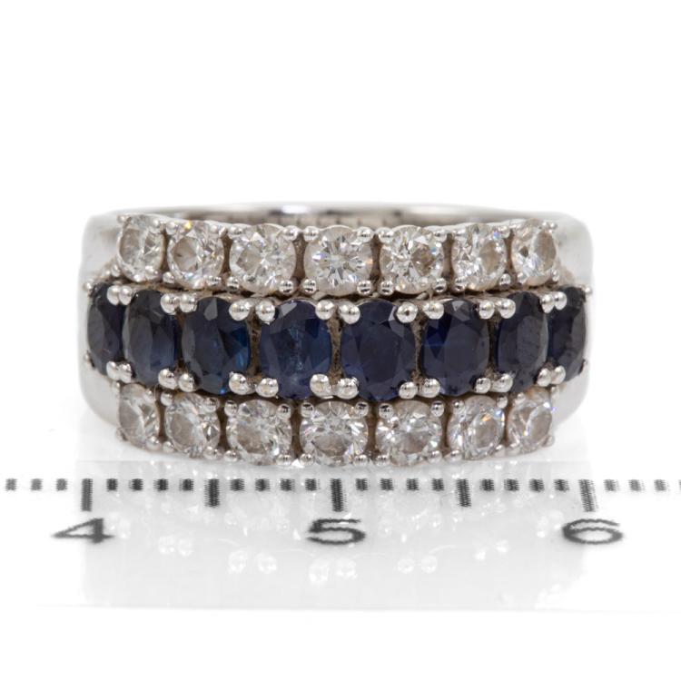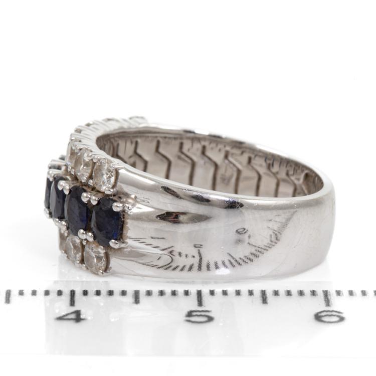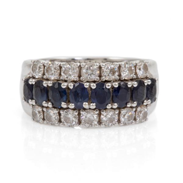 Sapphire and Diamond ring with 8 oval shape natural blue Sapphires totalling approximately 1.10cts and round Natural Diamonds totalling approximately 1.10cts (Estimated grading: H-I SI). 18ct white gold. Ring size P½. Band width: 6.2mm - 8.5mm. Weight 8.2g. (Pre-owned)