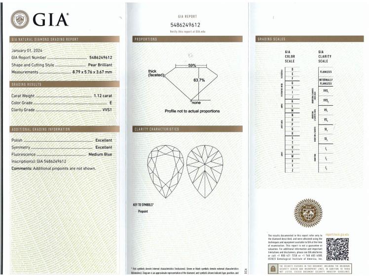 A loose pear shape Natural Diamond of 1.12ct (with GIA report graded as E VVS1 #5486249612