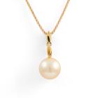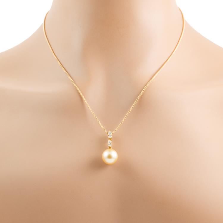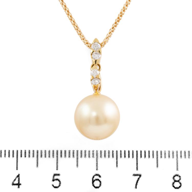Pearl and Diamond pendant with Golden South Sea Pearl of 11.4mm and round natural Diamonds totalling 0.20ct. 18ct yellow gold with 18ct yellow gold adjustable 44.0cm chain. Weight: 6.2g. (Pre-owned)