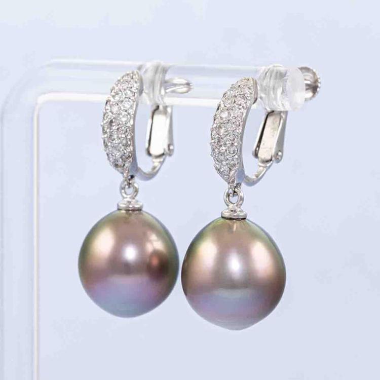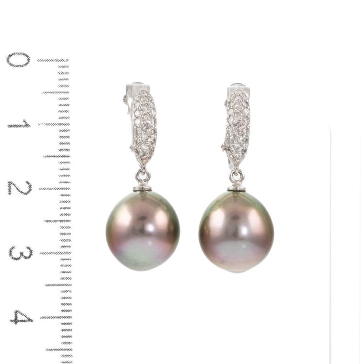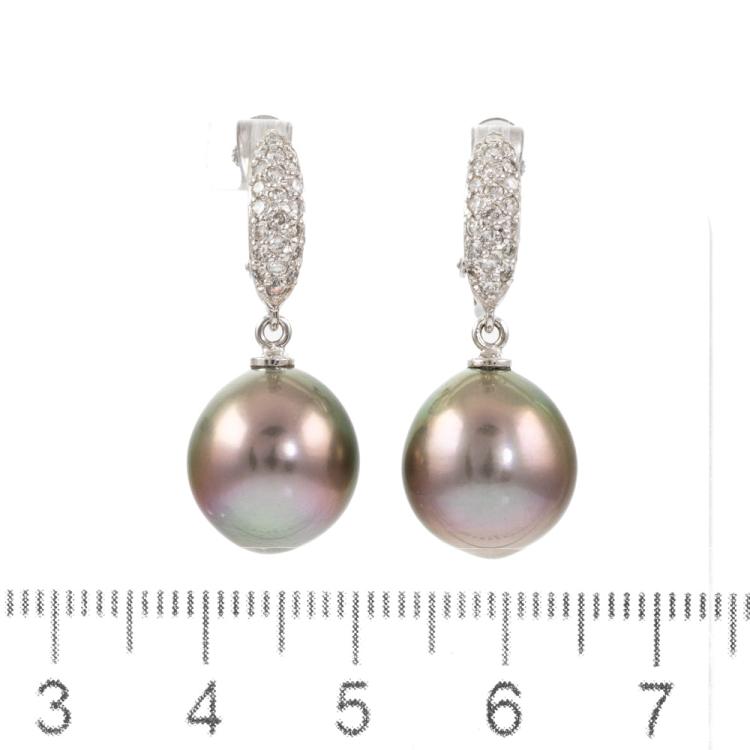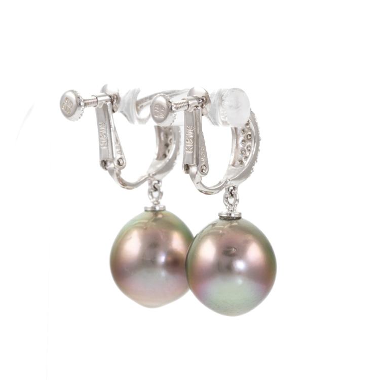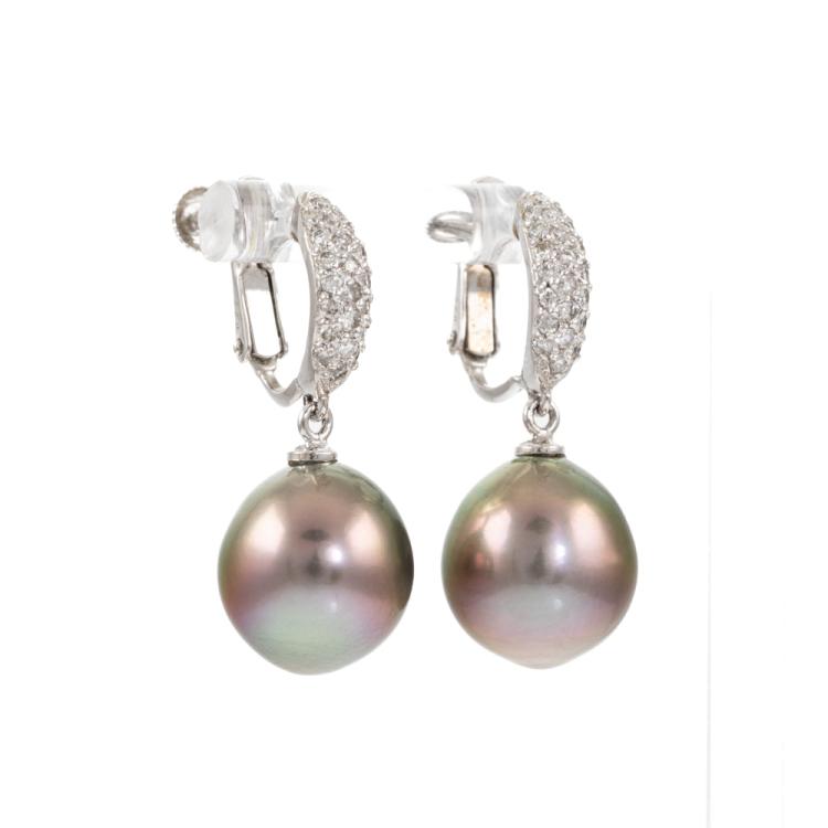 Pearl and Diamond screw back earrings (for non pierce ears) with 2 Tahitian Pearls of 11.6mm - 11.8mm and round natural Diamonds totalling 0.22ct. 18ct white gold. Weight: 8.0g. (Pre-owned)