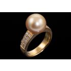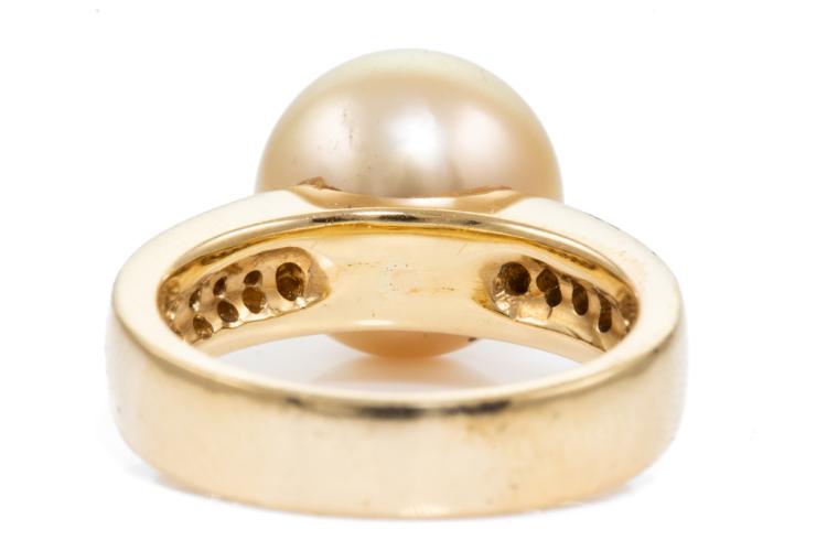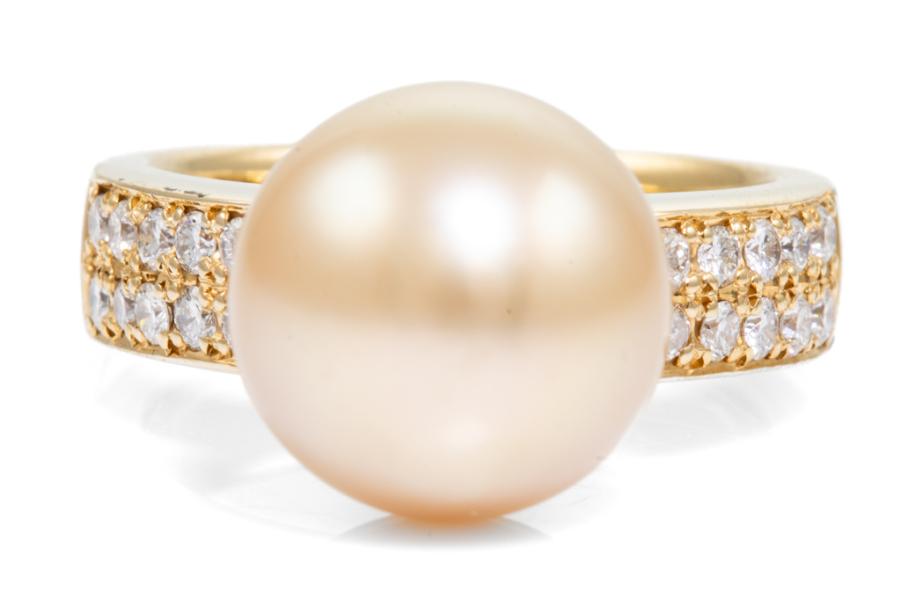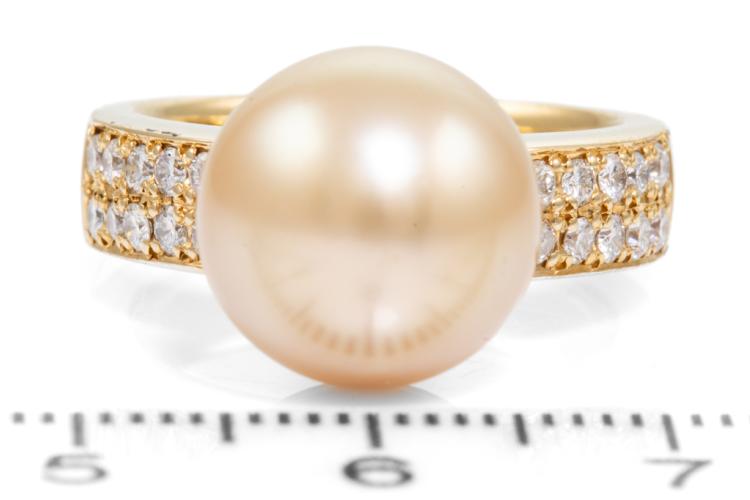 Pearl and Diamond ring with a Golden South Sea Pearl of 11.8mm and round Natural Diamonds totalling 0.40ct (Estimated grading: H SI). 18ct yellow gold. Ring size M. Weight: 11.1g. (Pre-owned)