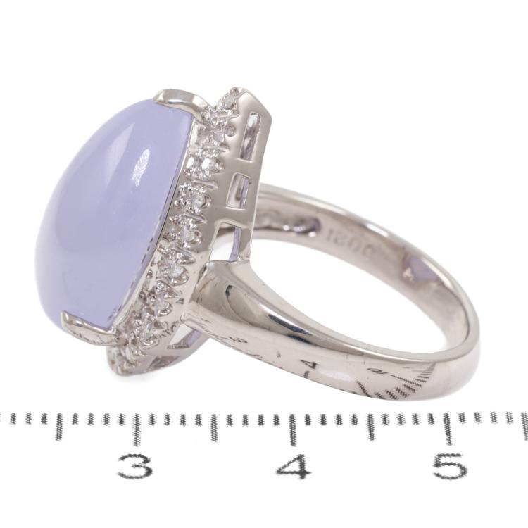 Jade and Diamond ring with oval cabochon cut natural Lavender Jadeite Jade - Type A of 11.92ct and round Natural Diamonds totalling 0.21ct. 14ct white gold. Ring size N1/2. Band width: 3.2mm-4.5mm. Weight: 7.5g. (Pre-owned)