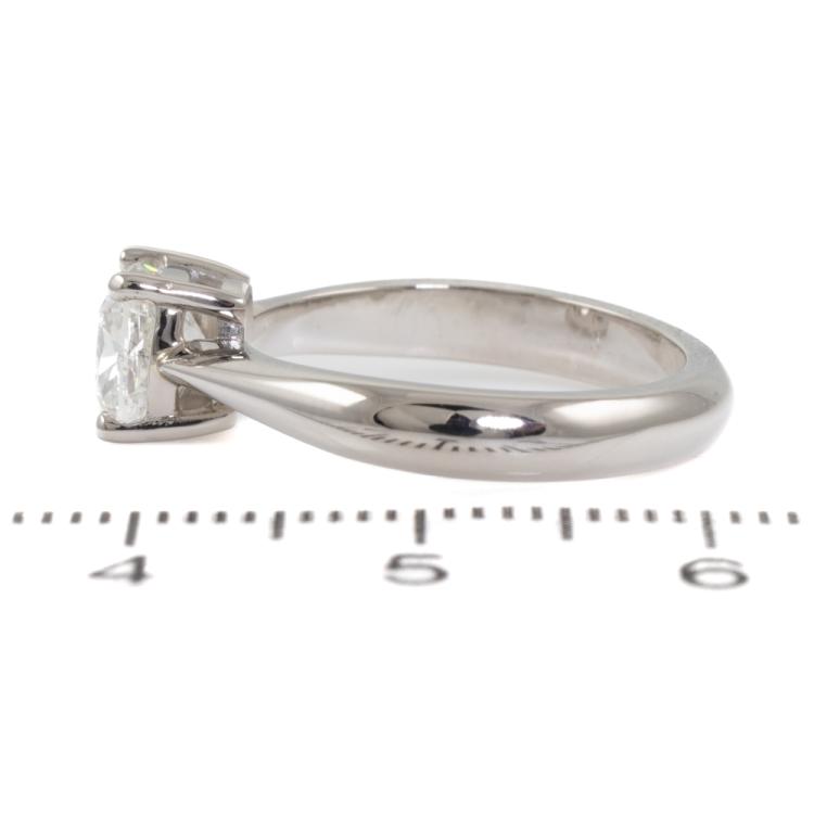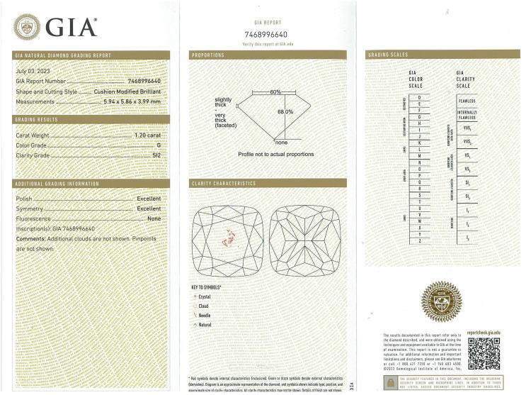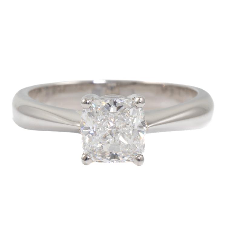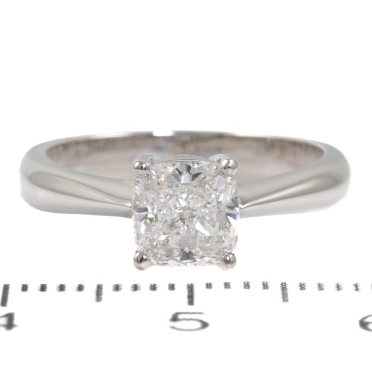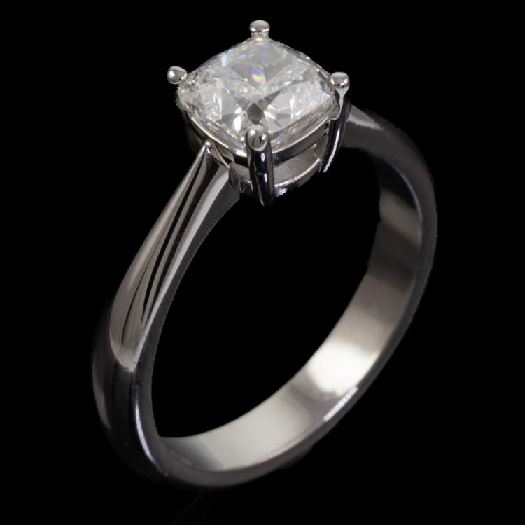 Diamond solitaire ring with cushion cut natural Diamond of 1.20ct (with GIA Report graded as G SI2 #7468996640). Platinum 950. Ring size K. Band width 3.1mm - 2mm. Weight: 6.1g (New)