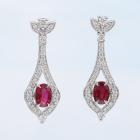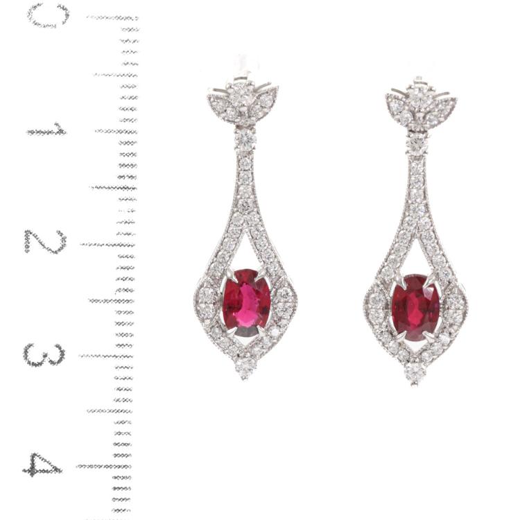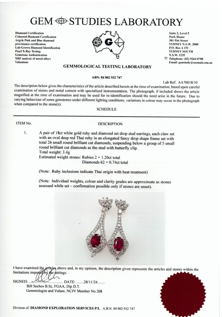 Ruby and Diamond drop earrings with 2 oval shape Natural Thai Rubies totalling 1.20ct and round Natural Diamonds totalling 0.74ct (Estimated grading: H-I SI). 18ct white gold. Weight: 3.4g. With GSL Description Report #AA 70018/10. (Pre-owned)