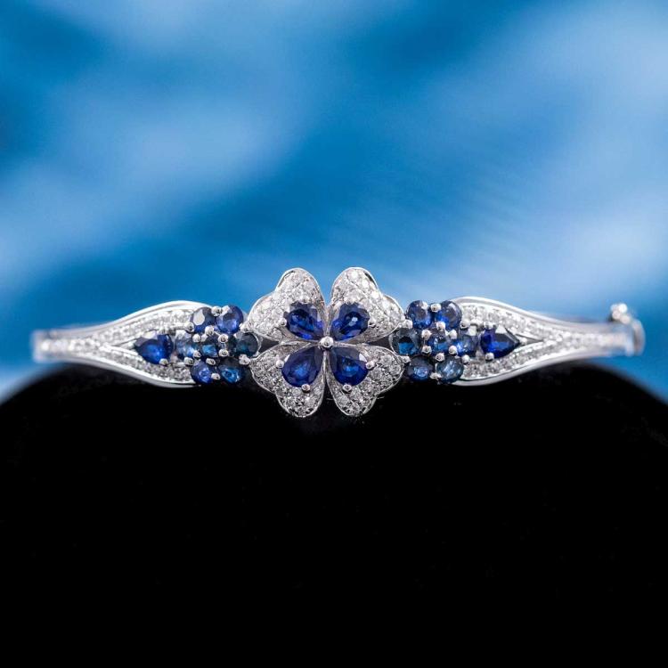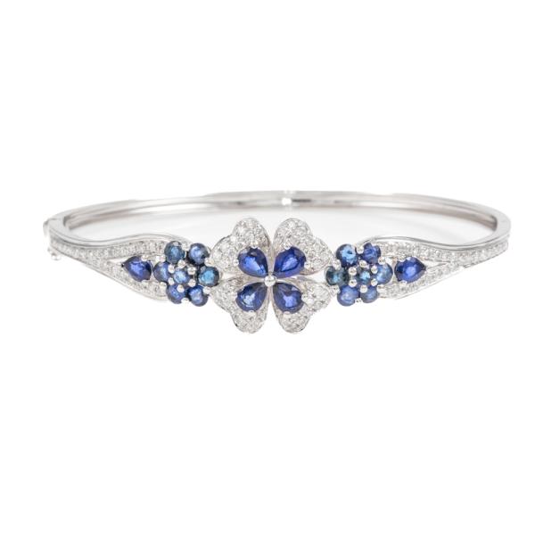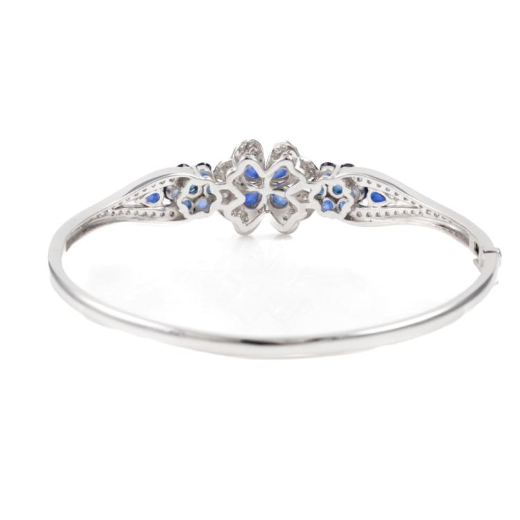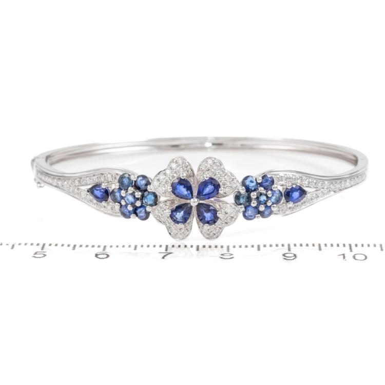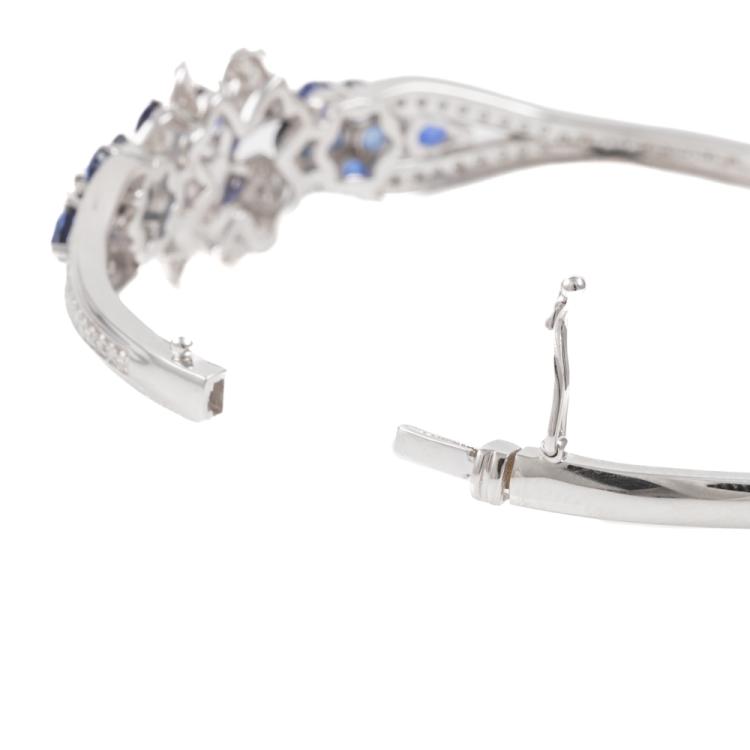 Sapphire and Diamond bangle with round & pear shape blue Natural Sapphires totalling approximately 1.20cts and round Natural Diamonds totalling 0.86cts (Estimated grading: H-I SI-P1). 18ct white gold. Circumference: 16cm. Weight: 13.1g. (Pre-Owned)