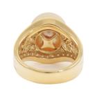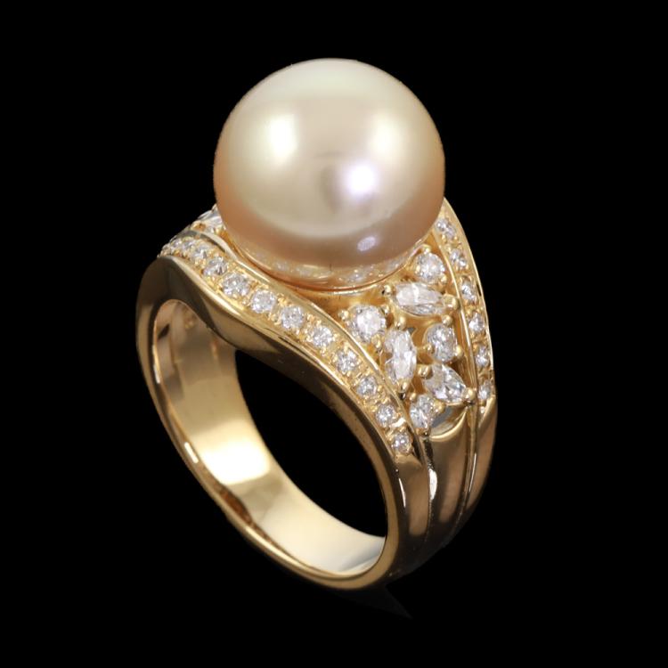 Pearl and Diamond ring with Golden South Sea Pearl of 12.0mm with round & marquise cut Natural Diamonds totalling 0.78ct (Estimated grading G-H SI) . 18ct yellow gold . Ring size M1/2. Band width: 4.5mm - 8.2mm. Weight: 12.2g. (Pre-owned)