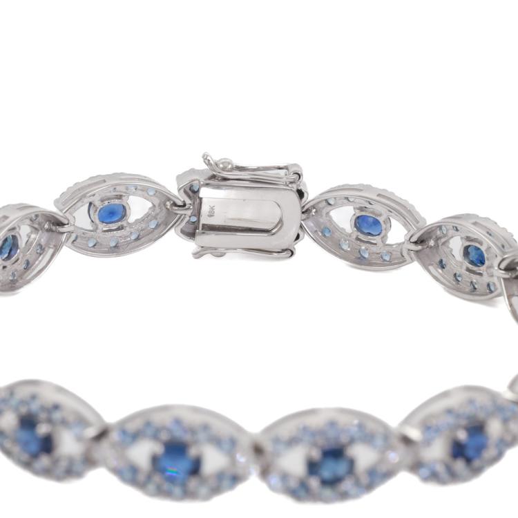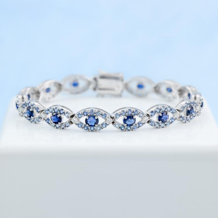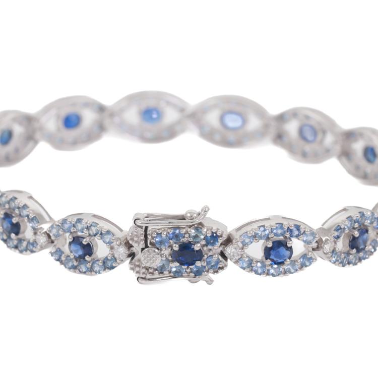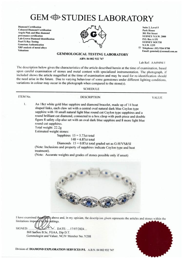 Sapphire and Diamond bracelet with oval shape dark blue Ceylon Natural Sapphires totalling 5.73ct, round light blue Ceylon Natural Sapphires totalling 6.87ct and round Natural Diamonds totalling 0.87ct (G-H VS SI). 18ct white gold. Length: 19cm. Weight: 22.2g. With GSL description certificate #AA69494/1. (As new)
