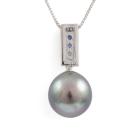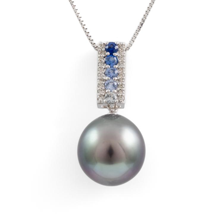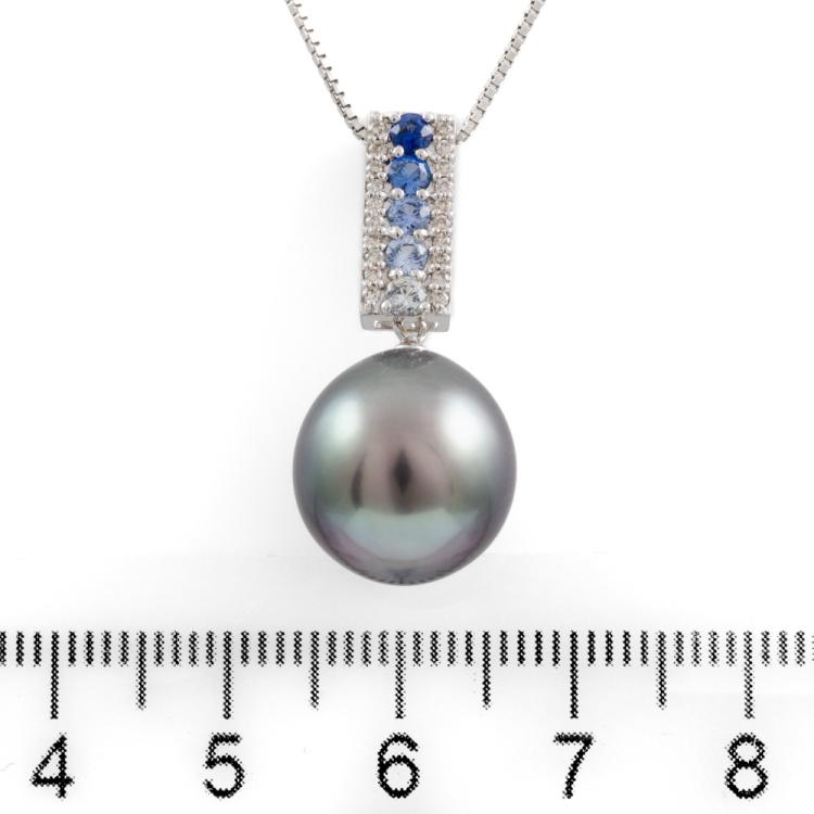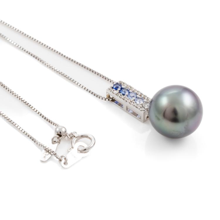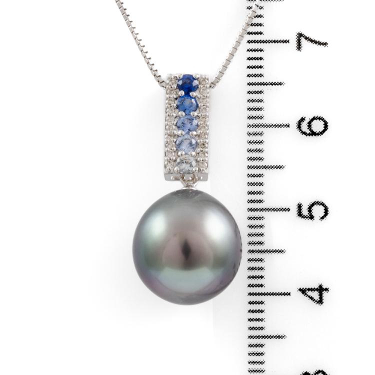 Pearl drop pendant with Tahitian Pearl of 12.7mm, round natural blue Sapphires totalling 0.33ct and round natural Diamonds totalling 0.10ct. 14ct white gold (XRF tested, stamped K18) with 18ct white gold adjustable 45cm chain. Weight: 7.4g. (Pre-owned)