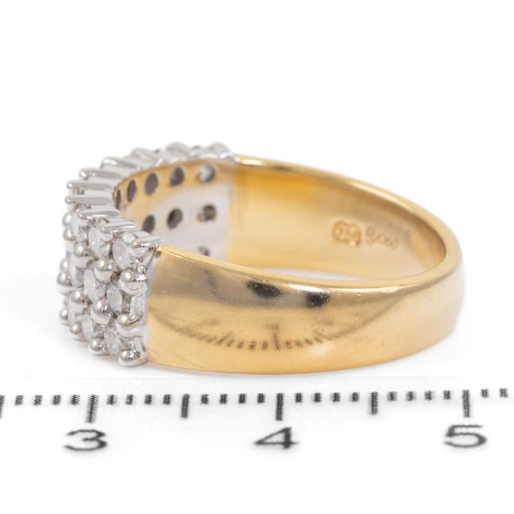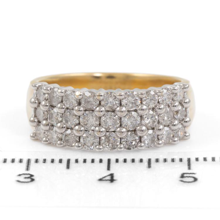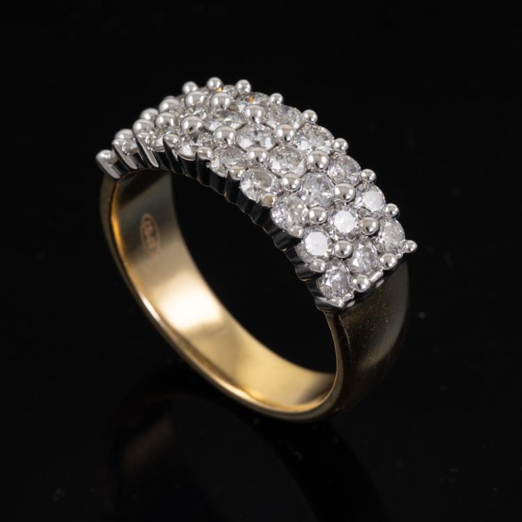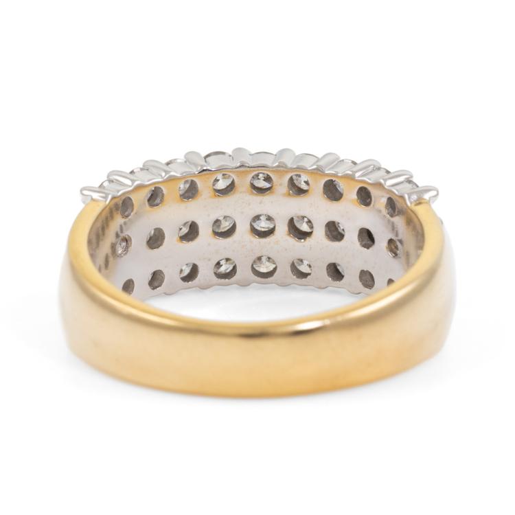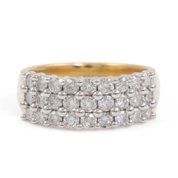 Diamond dress ring with round natural Diamonds totalling approximately 1.30ct (Estimated grading: H-I SI). 18ct yellow and white gold. Ring size P. Band width: 4.4 - 6.7mm. Weight: 8.7g. (Pre-owned)