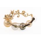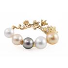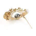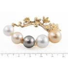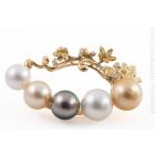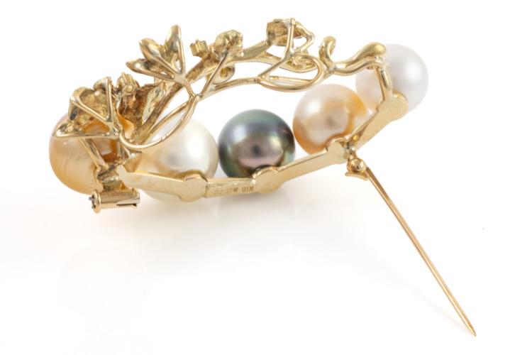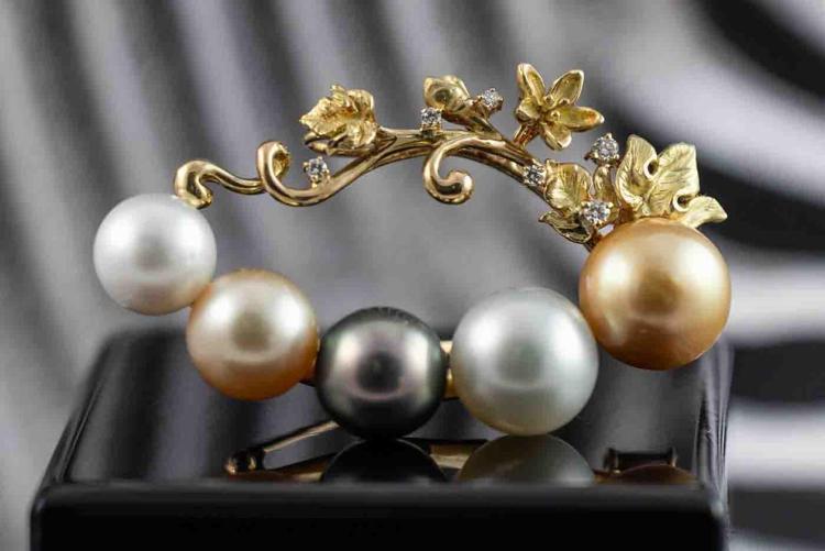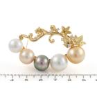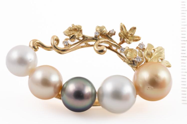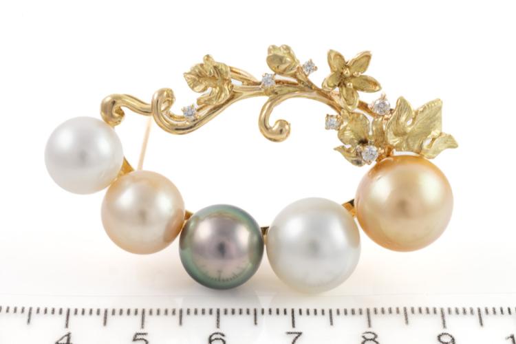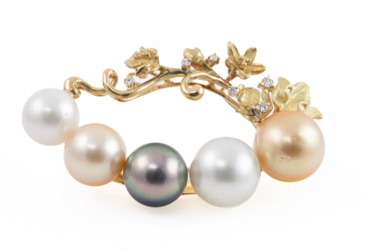 Pearl and Diamond brooch with two Golden South Sea Pearls of 13.3mm & 11.2mm, two South Sea Pearls of 12.9mm & 10.6mm and a Tahitian Pearl of 11.7mm and round Natural Diamonds totalling 0.18ct. 18ct yellow gold. Weight: 24.8g. (Pre-owned)