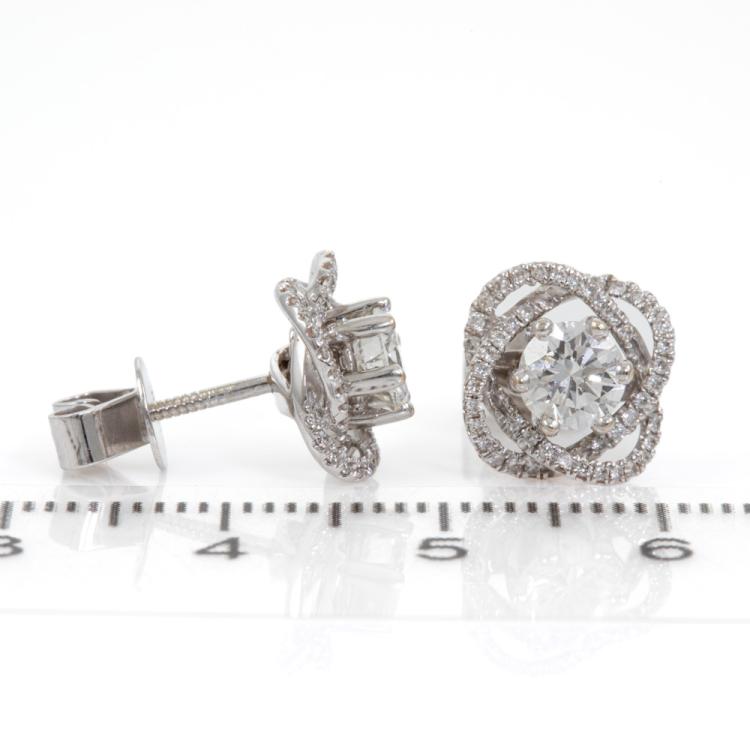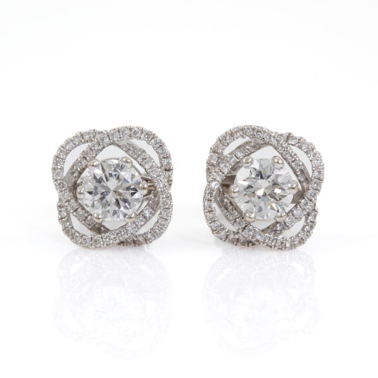 Diamond halo set earring with 2 centre round natural Diamonds totalling 0.90cts (Estimated grading: G VS) and surrounding round natural Diamonds totalling approx. 0.50cts (Estimated grading: G-H SI). 18ct white gold with 18ct white gold backs. Weight: 3.5g. (Pre-owned)
