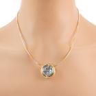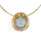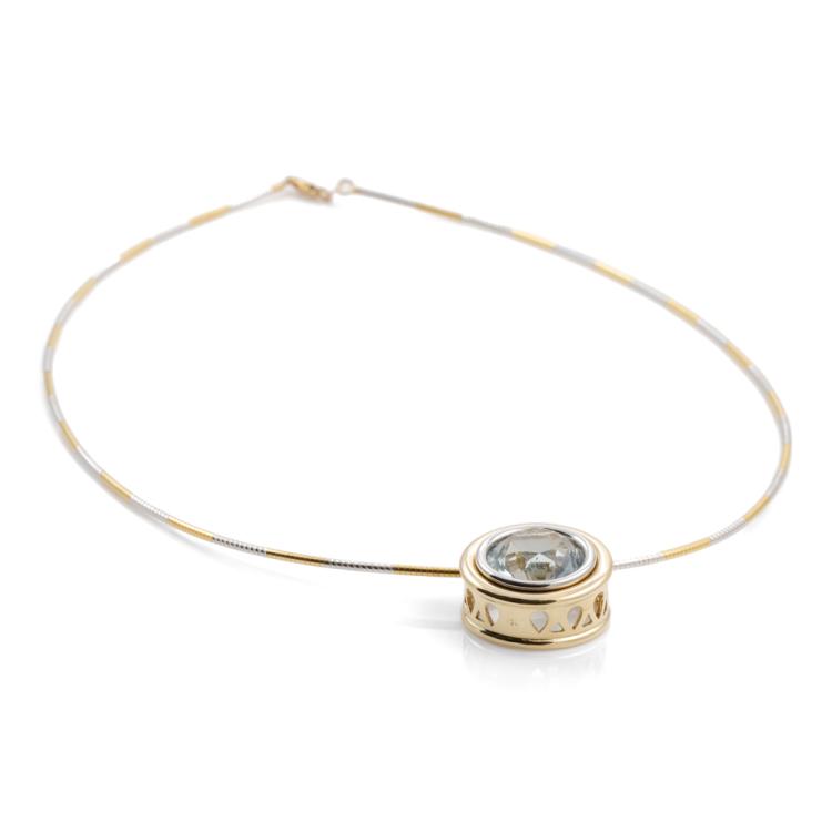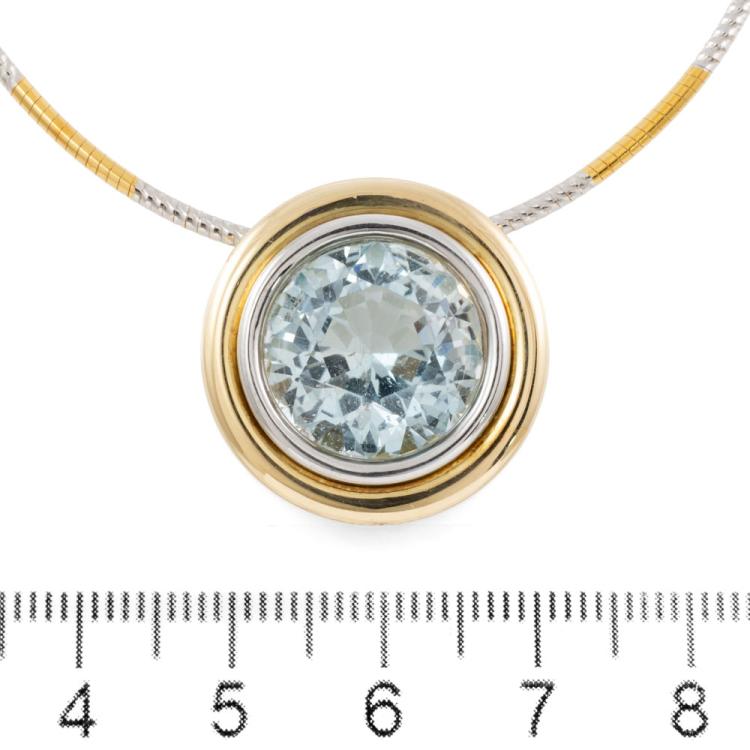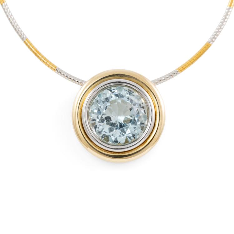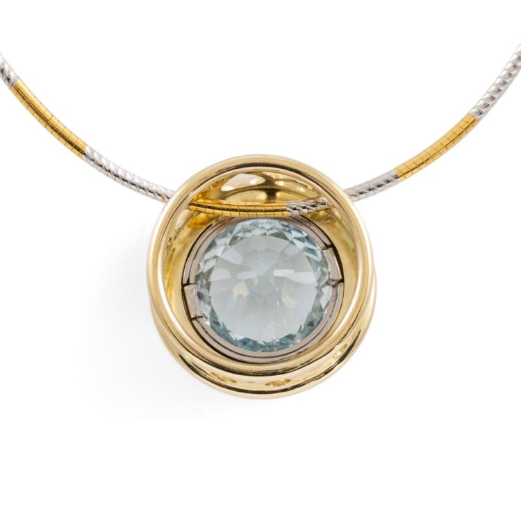 Topaz pendant with round bezel set natural blue Topaz of approximately 14.17ct. 18ct yellow & white gold with 45.5cm 18ct yellow & white gold Omega chain. Weight: 24.2g. With Valuation Certificate dated 08/08/2005. (Pre-owned)