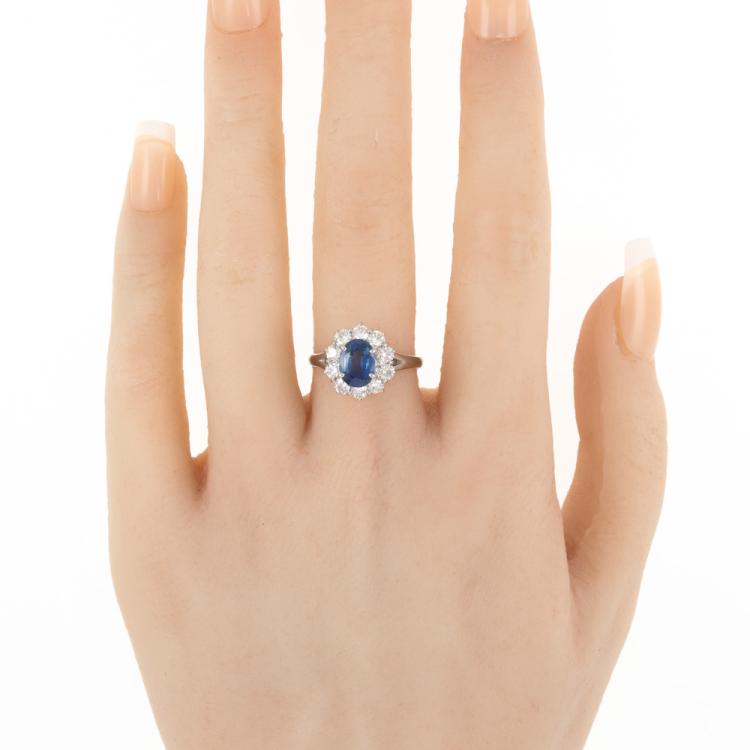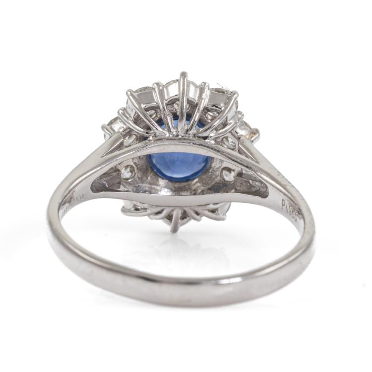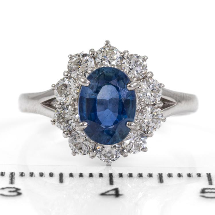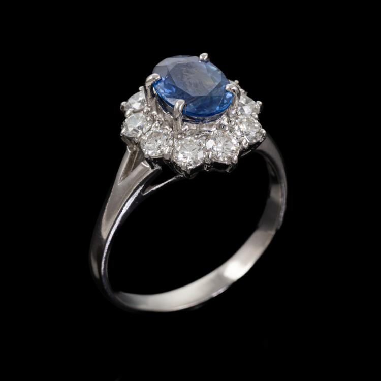 Sapphire and Diamond ring with oval shape natural blue Sapphire of 1.44ct and round natural Diamonds totalling 0.81ct (Estimated grading: G-H VS). Platinum 950. Ring size M. Band width: 2.2mm - 3.1mm. Weight: 5.7g. (Pre-owned)