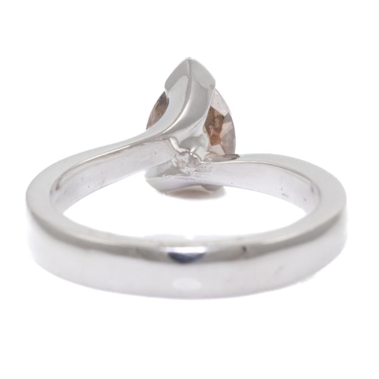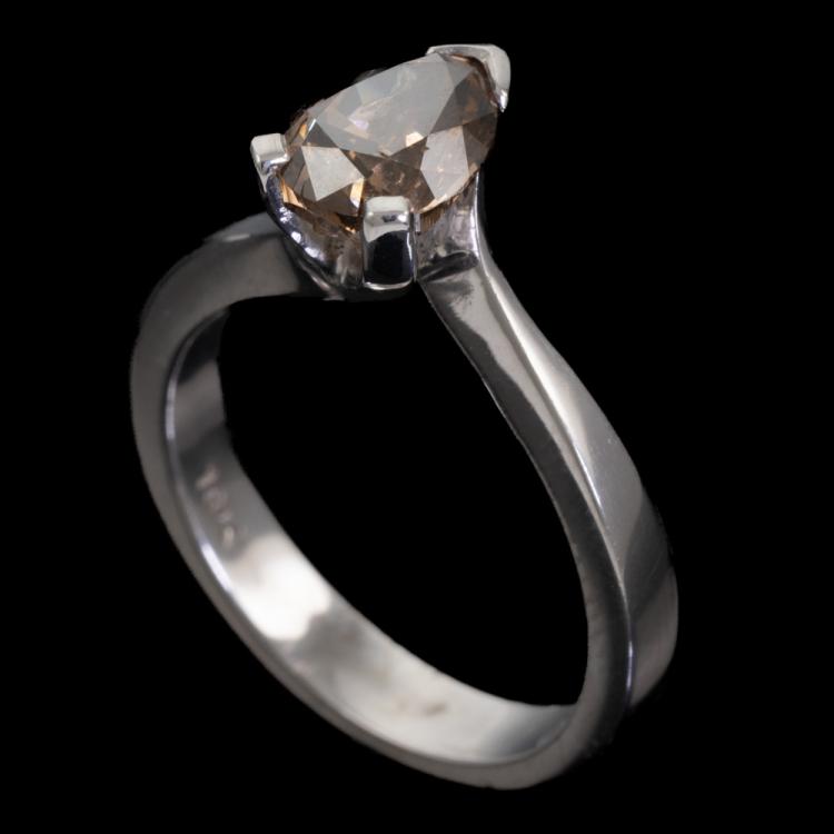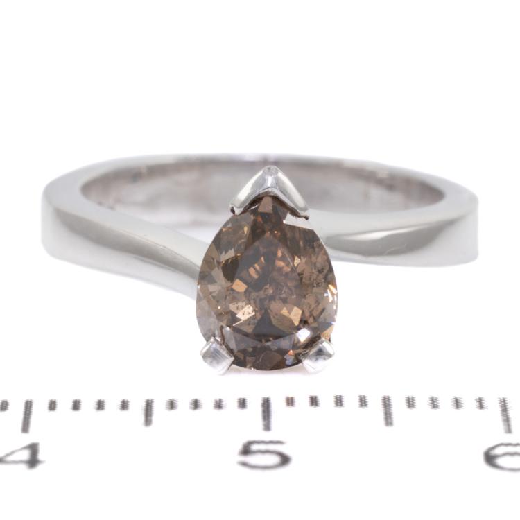 Diamond solitaire ring with a pear shape natural Diamond of 1.45ct (Estimated grading: Dark Champagne - P1). 18ct white gold. Ring size L. Band width: 3.4mm-1.6mm. Weight: 5.7g. (As new)