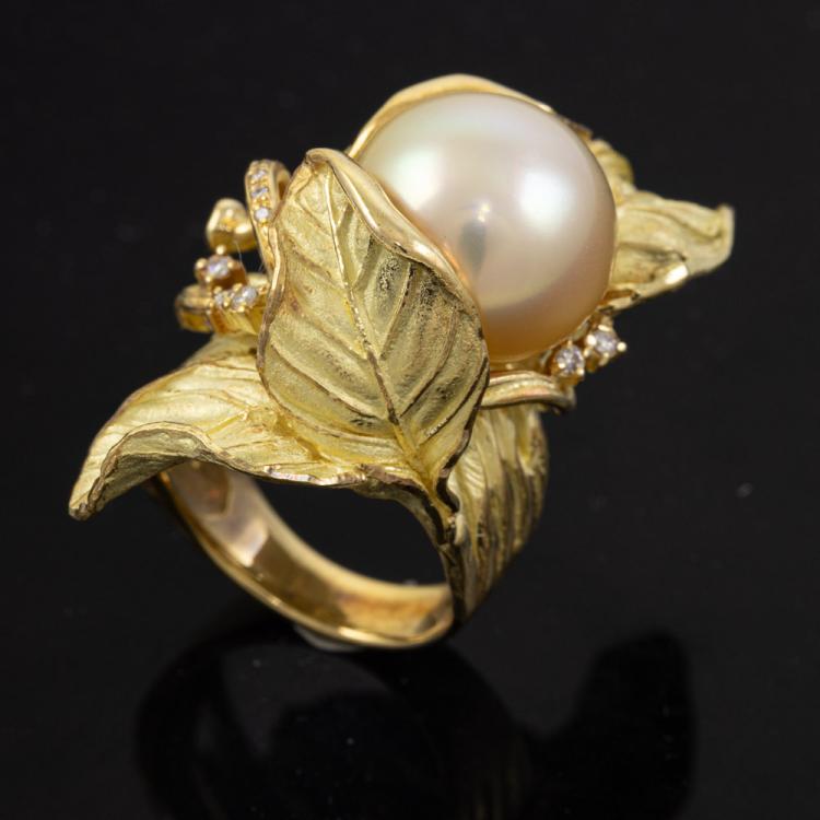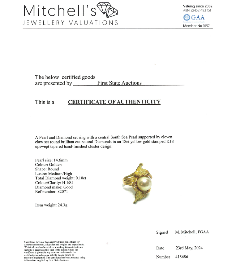 Pearl and Diamond ring with South Sea Pearl of 14.6mm and round natural Diamonds totalling 0.10ct. 18ct yellow gold. Ring size M. Band width: 4.6mm - 7.8mm.. Weight: 24.3g. With Certificate #418686. (Pre-owned)