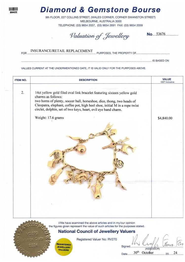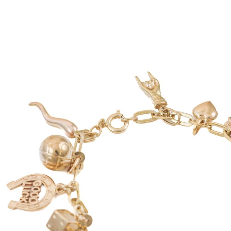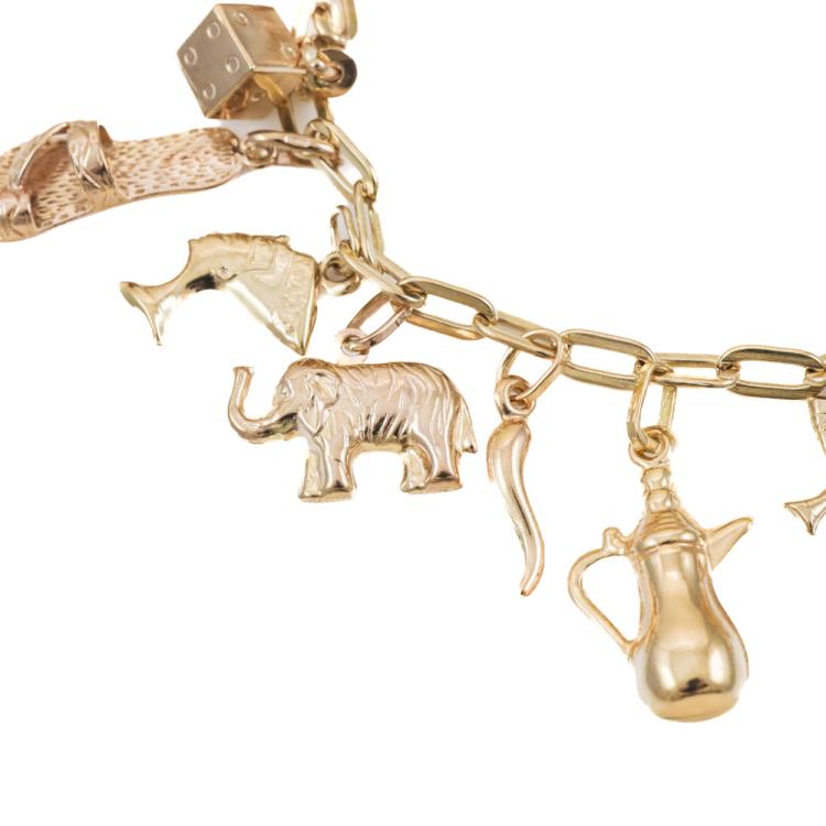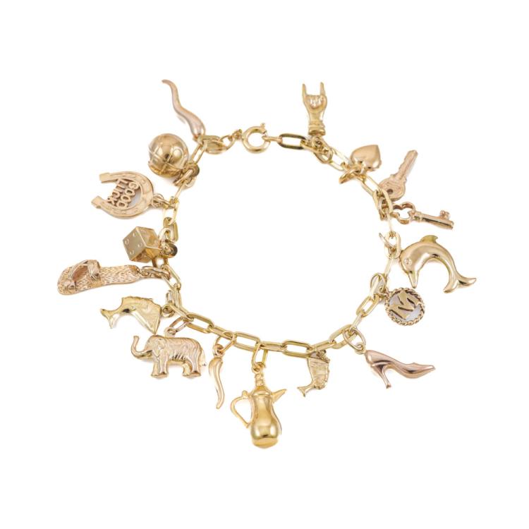 Gold charm bracelet comprised of oval links with 16 attached charms: two horns of plenty, soccer ball, good luck horseshoe, dice, sandal, two Cleopatra heads, elephant, coffee pot, high heel shoe, initial M, dolphin, set of two keys, heart and evil eye hand. 14ct yellow gold chain with 18ct yellow gold heart and coffee pot charms, 9ct rose gold for high heel shoe & horn and 9ct yellow gold for all other charms. Length: 19cm. Weight: 17.6g. With Valuation 30/10/24(Pre-owned)