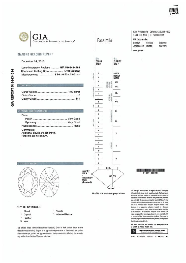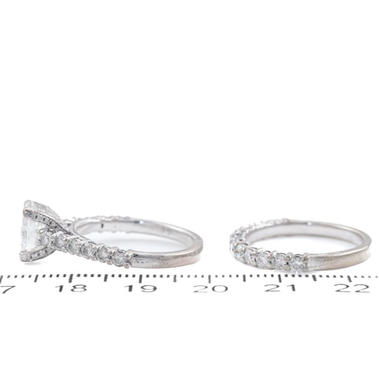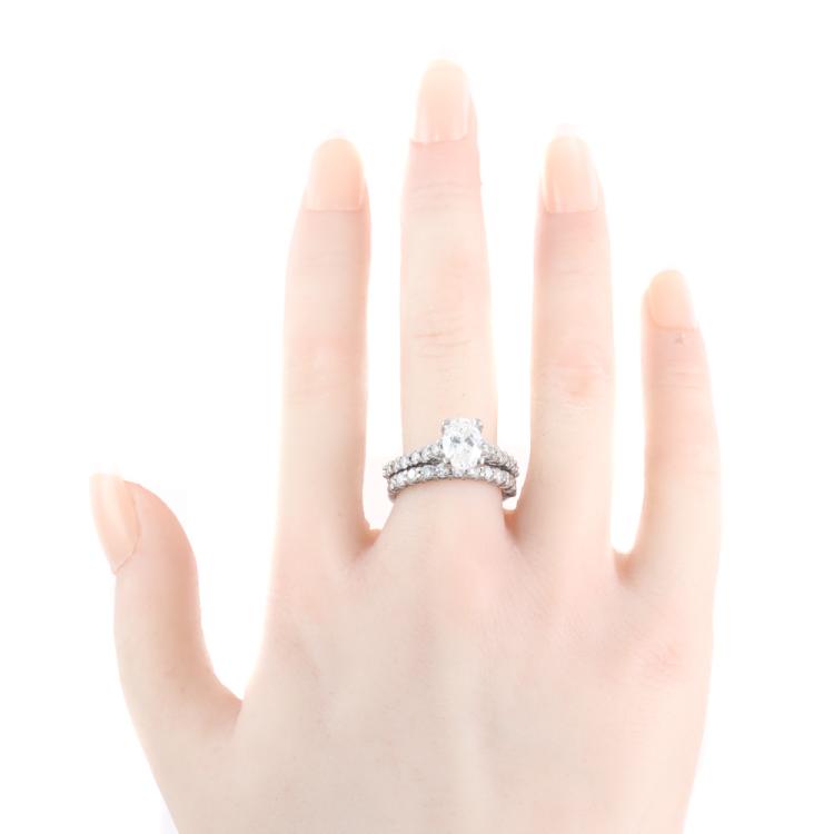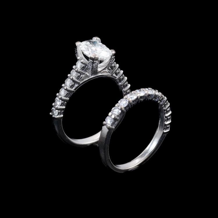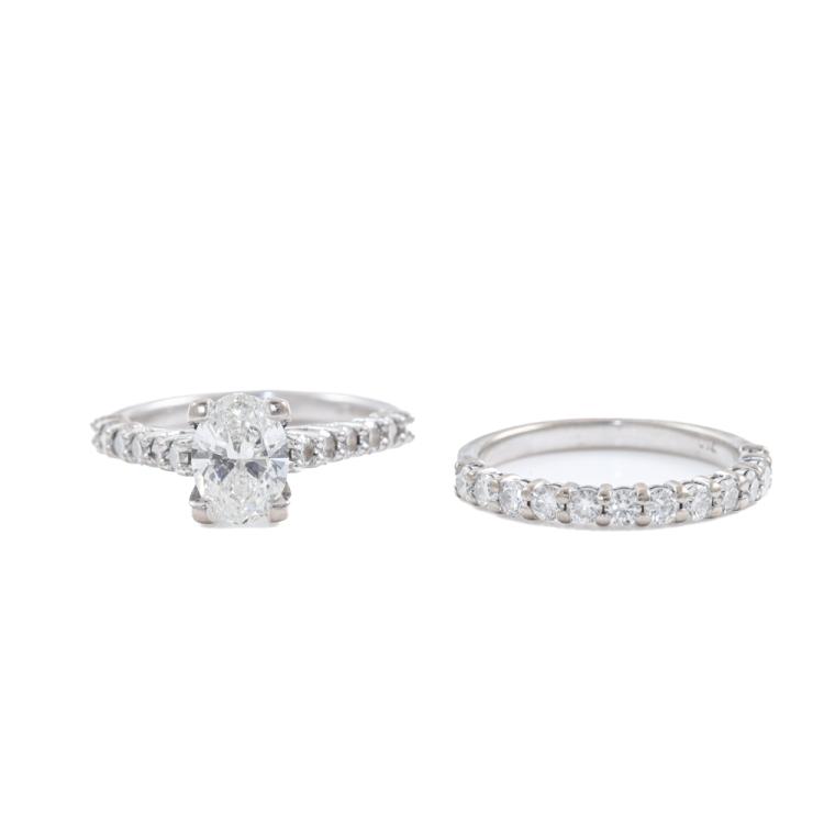Diamond engagement ring & eternity ring set. 1) Diamond Solitaire ring with centre oval Natural Diamond of 1.50ct (Copy of GIA Report graded as F SI1 #5166434594) and rest round Natural Diamonds totalling approx. 0.70ct (Estimated grading: H-I SI). Ring size N. Band width: 2.5mm. 2) Diamond eternity ring with 12 round Natural Diamonds totalling approx. 0.60ct (Estimated grading: H-I SI). Ring size N. Band width: 2.2mm. Both 18ct white gold. Combined weight: 9.2g. (Pre-owned)