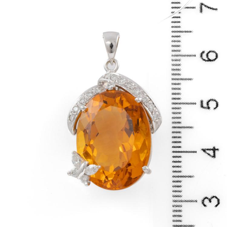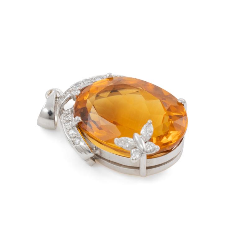 Citrine and Diamond pendant with oval shape natural Citrine of approximately 15.50ct and round & marquise cut natural Diamonds totalling approximately 0.30ct (Estimated grading: H VS). 18ct white gold. No chain provided. Weight: 9.0g. (Pre-owned)