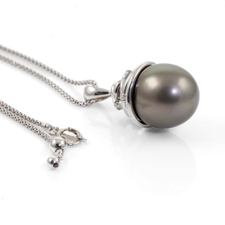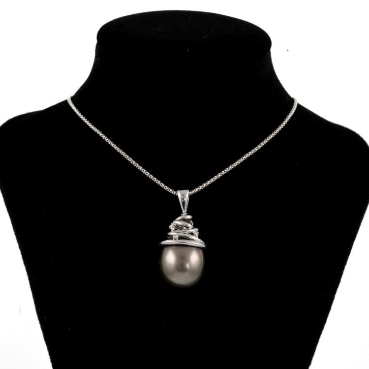 Pearl and Diamond pendant with Baroque Tahitian Pearl of 15mm and round Natural Diamonds totalling 0.04ct. 18ct white gold with 50cm 18ct white gold adjustable chain. Weight: 12.9g. (Pre-owned)