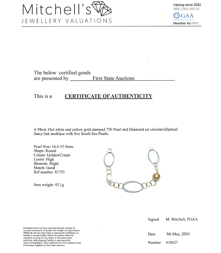 Pearl necklace with white and golden South Sea Pearls of 16.6mm - 15.0mm. 18ct yellow and white gold. Length: 94cm. Weight: 43.1g. With Certificate 418627. (Pre-owned)
