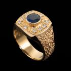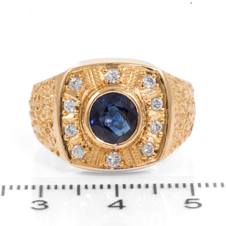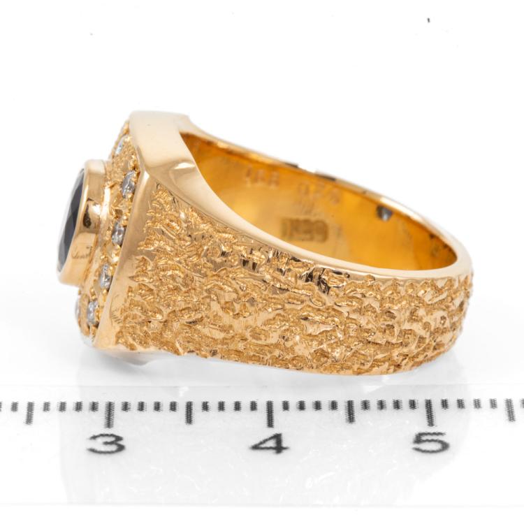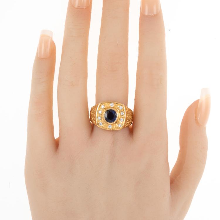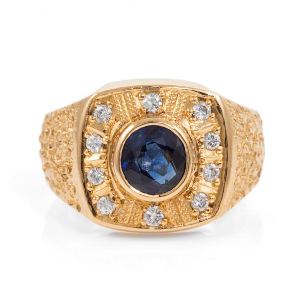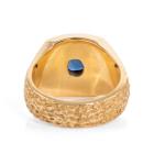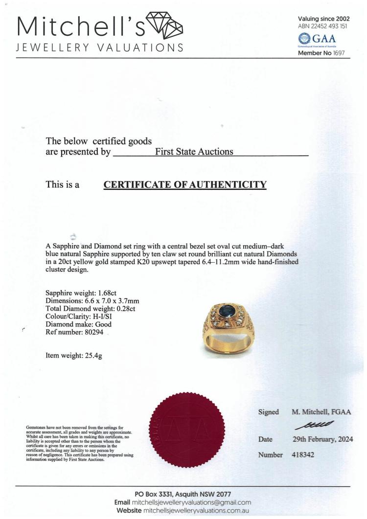 Mens ring with centre oval blue Natural Sapphire of 1.68ct (Sapphire with surface reaching inclusion) and round Natural Diamonds totalling 0.28ct. 20ct yellow gold. Ring size R1/2 - ring resizing is not recommended. Band width: 6.4 - 11.2mm. Weight: 25.4g. With Certificate 418342. (Pre-owned)