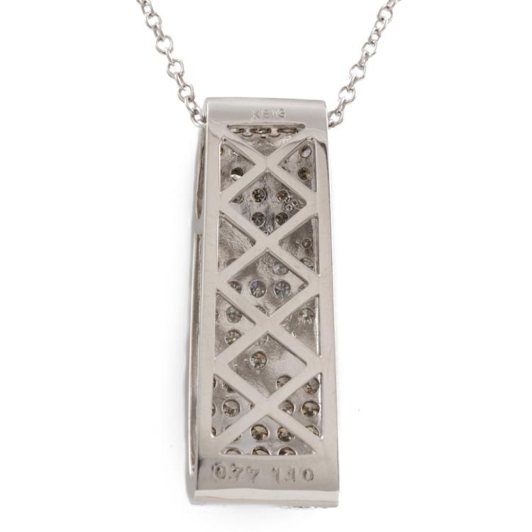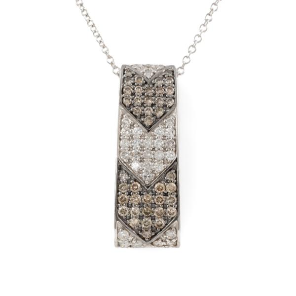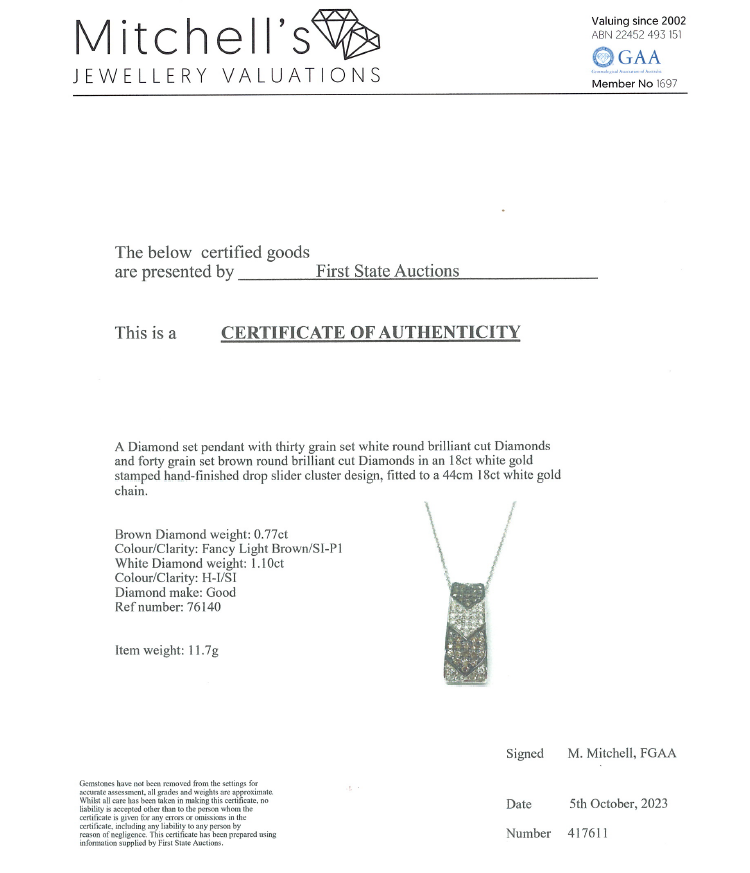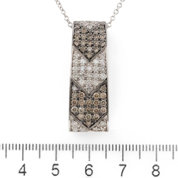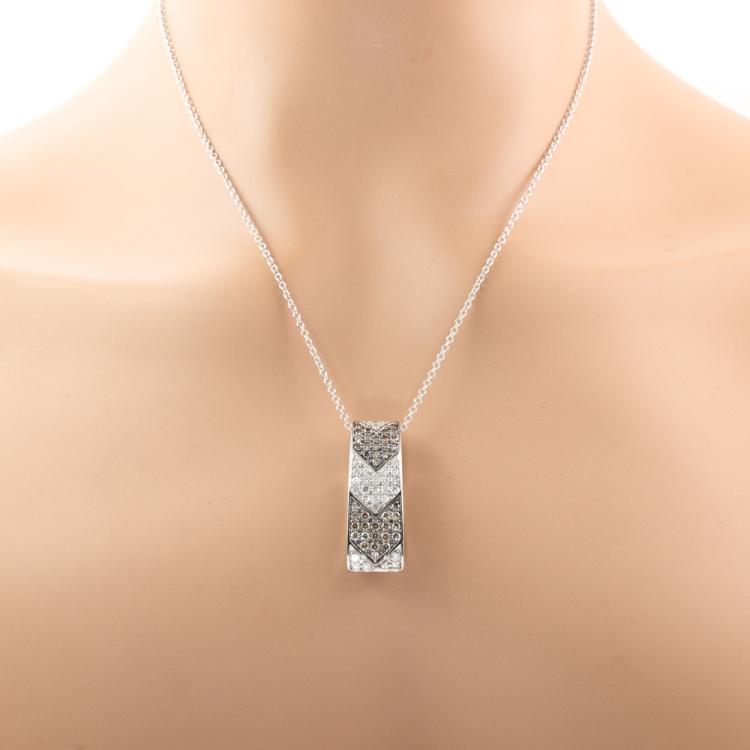 Diamond pendant with round brown natural Diamonds totalling 0.77ct (Estimated grading: Fancy Light Brown SI-P1) & remaining natural white Diamonds totalling 1.10ct (Estimated grading: H-I SI). 18ct white gold with black rhodium plating and 44cm 18ct white gold chain. Weight 11.7g. With Certificate #417611. (Pre-owned)