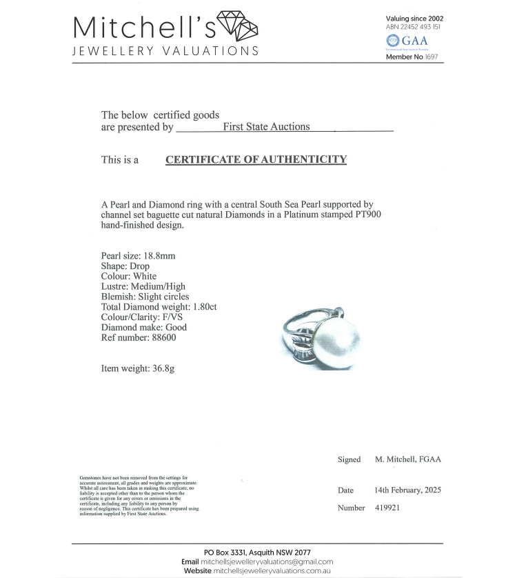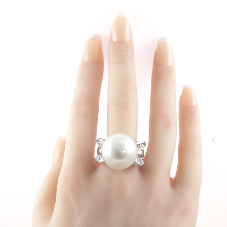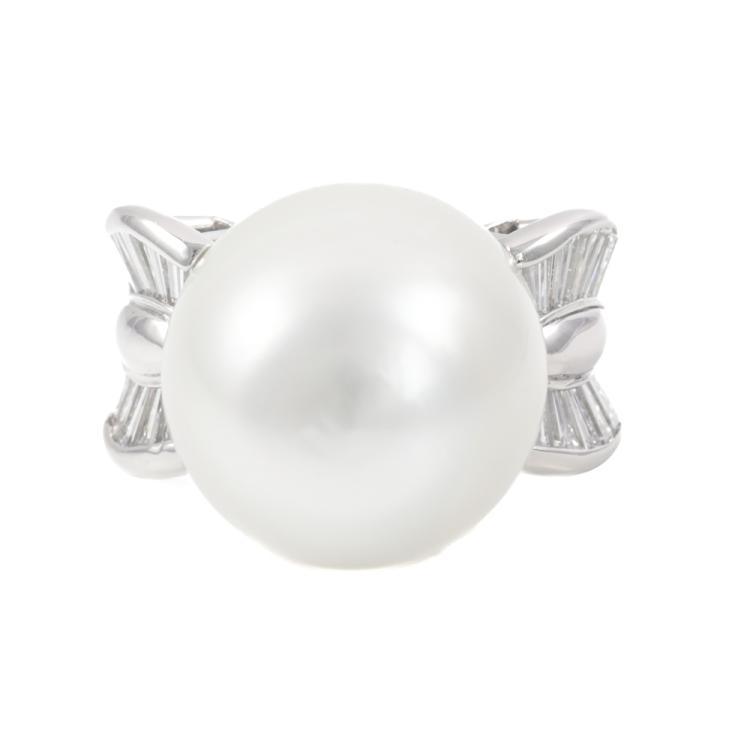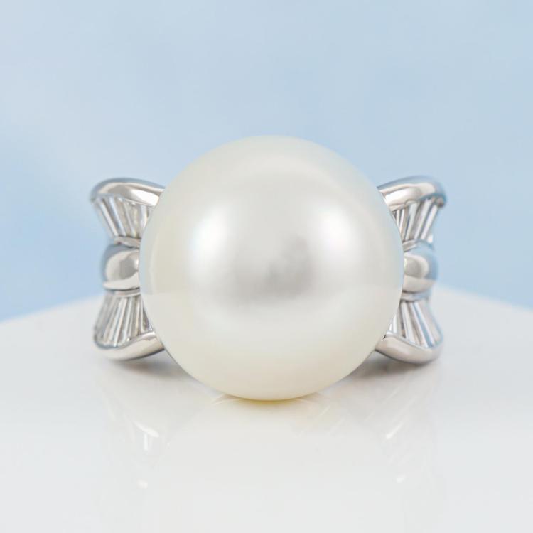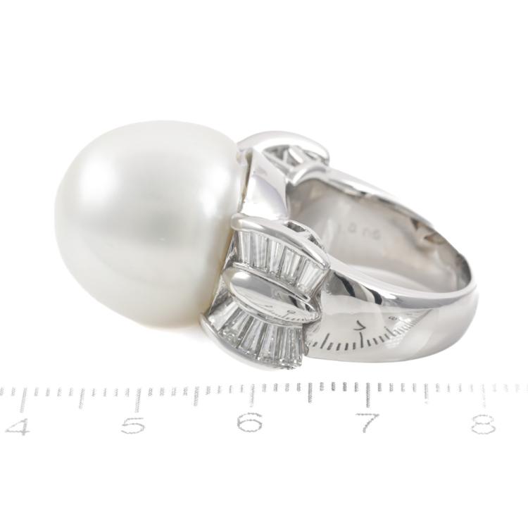 Pearl and Diamond ring with South Sea Pearl of approximately 18.8mm and baguette cut Natural Diamonds totalling 1.80ct (Estimated grading: F-G VS). Platinum - 900. Ring size O1/2. Band width: 5.2mm - 8.5mm. Weight: 36.8g. With Certificate #419921. (Pre-owned)