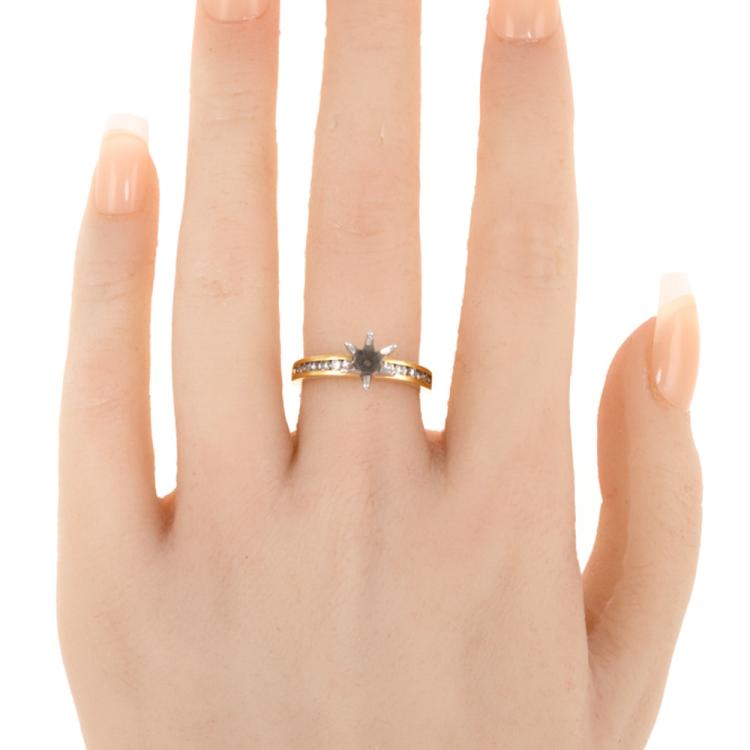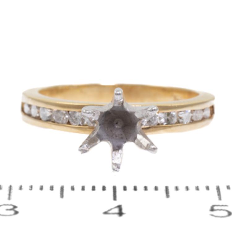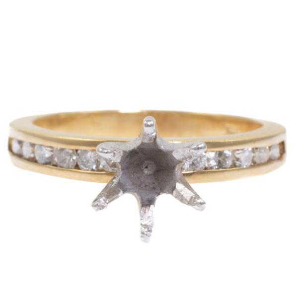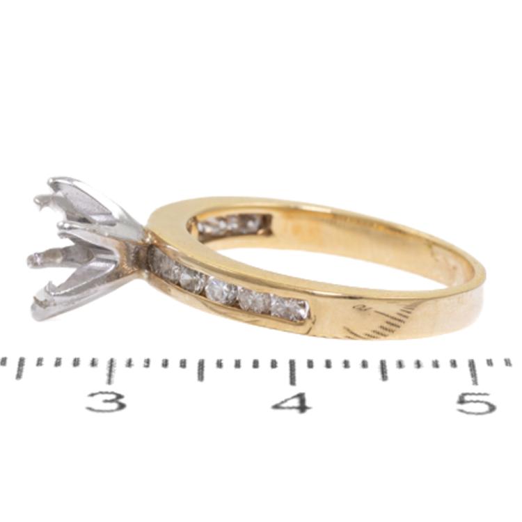 18ct gold 6 claw semi mount ring (note centre stone is not included) for 6.5mm centre round stone. Set with round natural Diamonds totalling 0.43ct (Estimated Grading: J P1). 18ct yellow and white gold. Ring size: M. Band width: 2.4mm - 3.0mm. Weight: 3.9g. (As new)