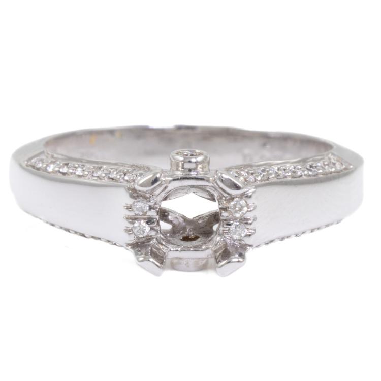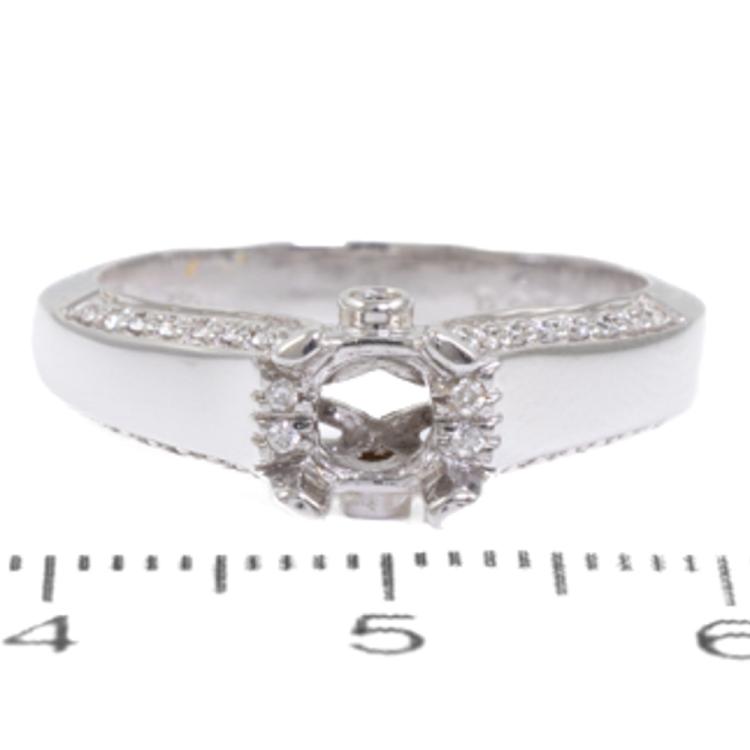 18ct white gold 4 claw semi mount ring (note centre stone is not included) for 6.0mm centre round stone. Set with round Natural Diamonds totalling 0.20ct. 18ct white gold. Ring size N. Band width: 3.4mm - 5.2mm. Weight: 5.1g (As New)