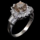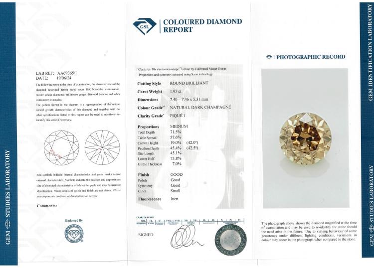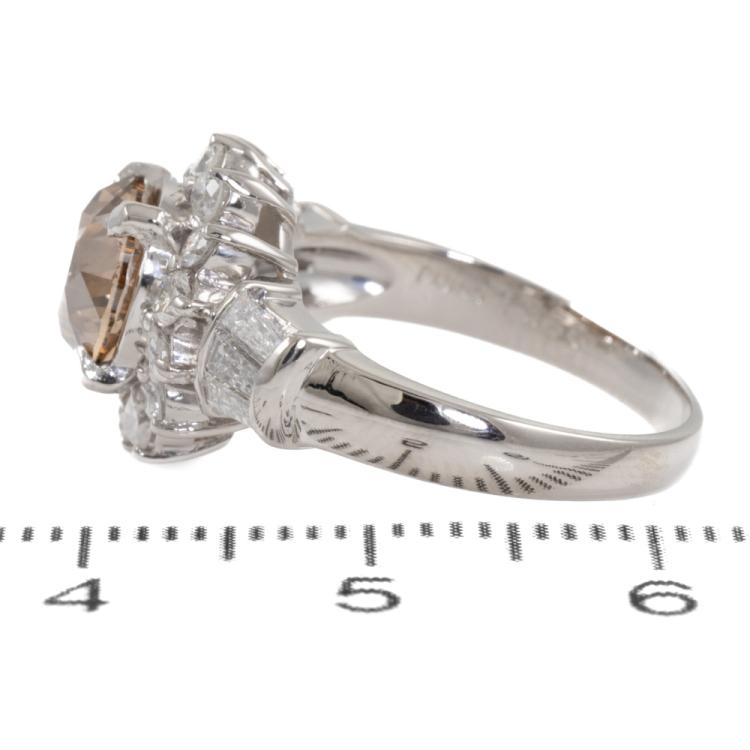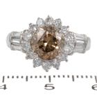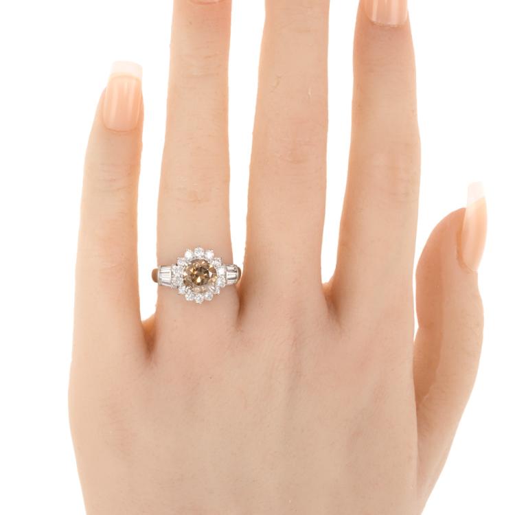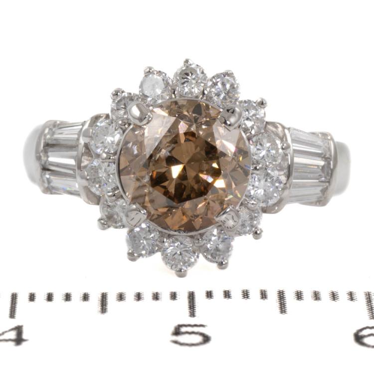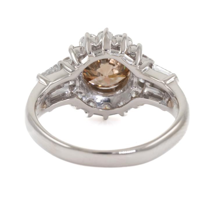 Diamond ring with round brilliant cut natural Champagne Diamond of 1.95ct (with GSL Report graded as Natural Dark Champagne P1 #AA69365/1) and surrounding round & baguette cut natural Diamonds totalling 0.81ct (Estimated grading: G VS-SI). Platinum 900. Ring size J1/2. Band width: 2.4mm - 4.4mm. Weight: 6.7g. (Pre-owned)