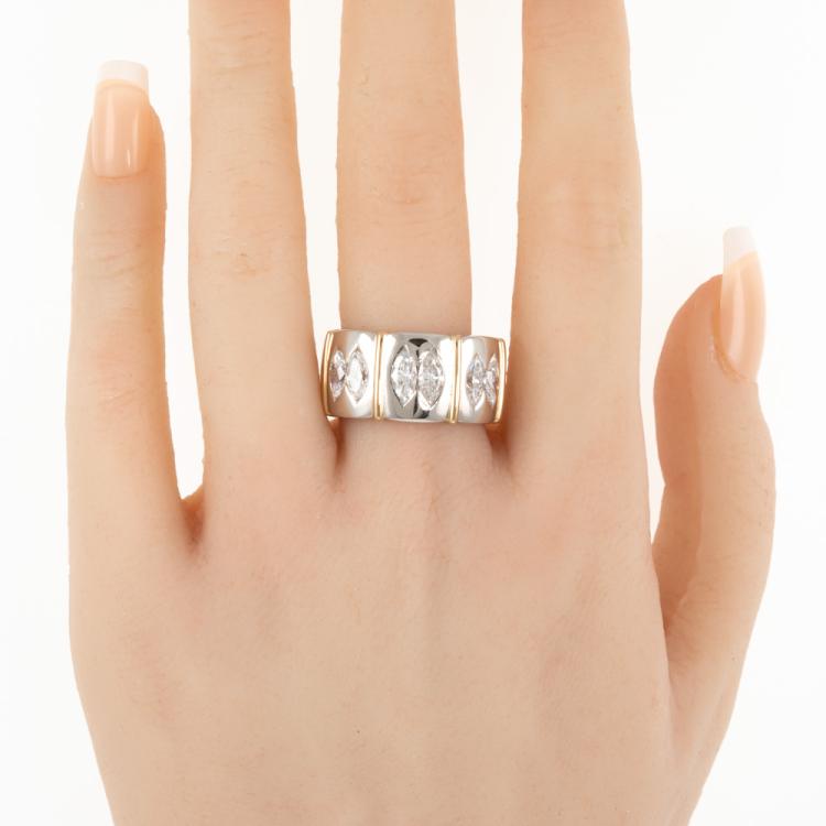 Diamond ring with 6 marquise cut Natural Diamonds totalling 1.96ct (Estimated grading: F-G VS). 18ct yellow gold and platinum. Ring size Q - ring resizing is not recommended. Weight: 20.1g. With Certificate #415872. (Pre-owned)