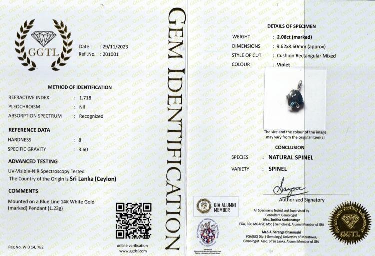 Spinel pendant with a cushion cut violetish blue Ceylon Natural Spinel of 2.08ct. 14ct white gold. No chain provided. Weight: 1.2g. With GGTL report #201001. (As new)^