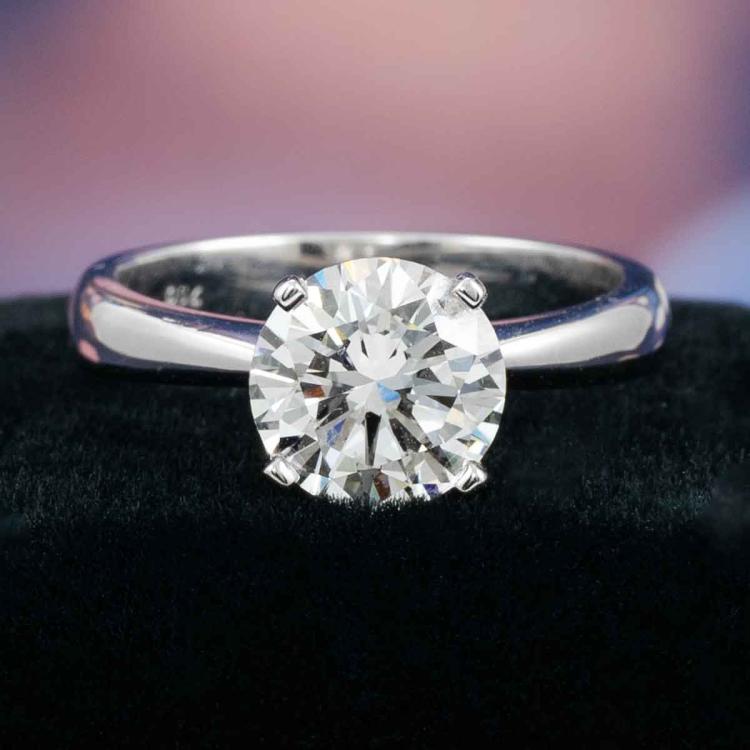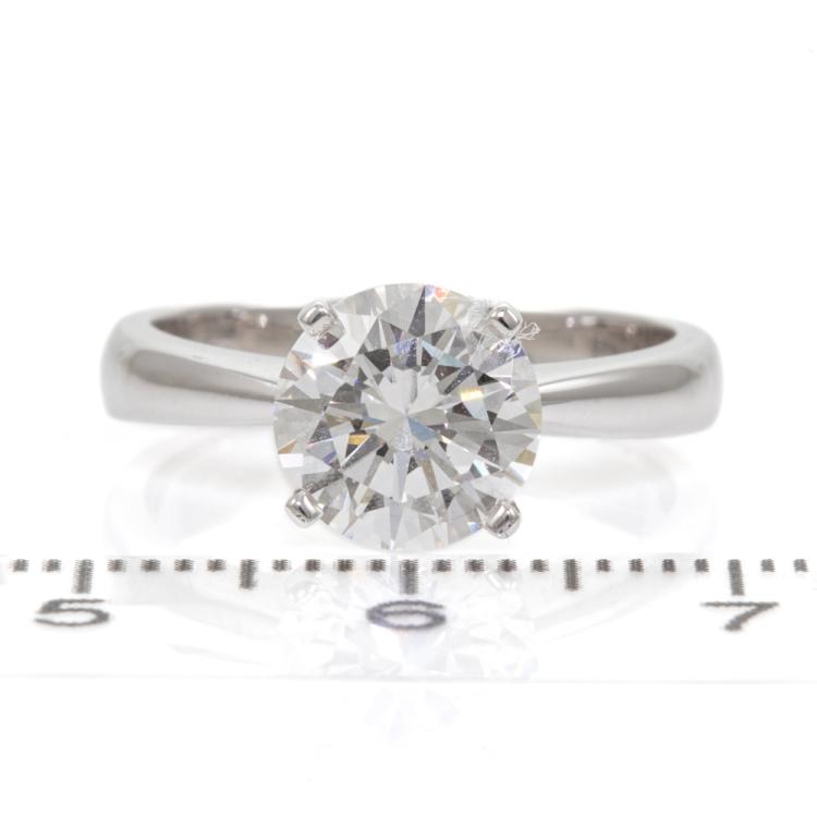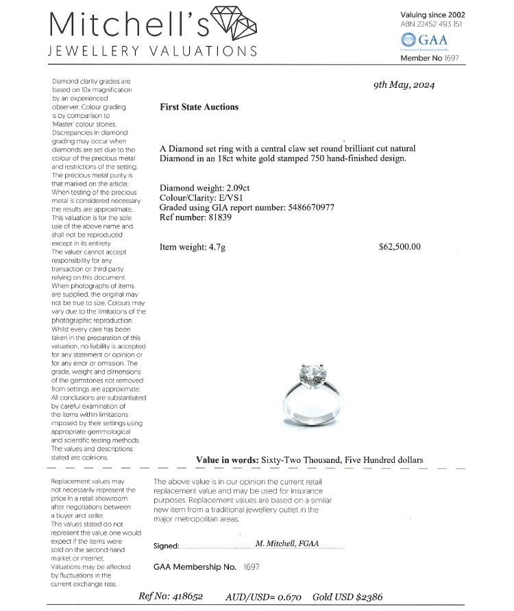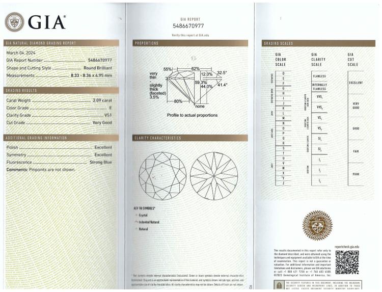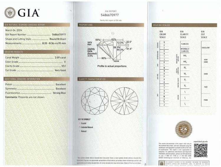 Diamond solitaire ring with round brilliant cut Natural Diamond of 2.09ct (with GIA Report graded as E VS1 #5486670977). 18ct white gold. Ring size: M. Band width: 3.3mm - 1.7mm. Weight: 4.7g. With Valuation Certificate #418652. (New)
