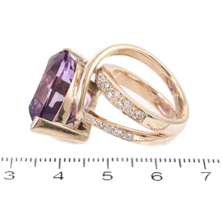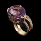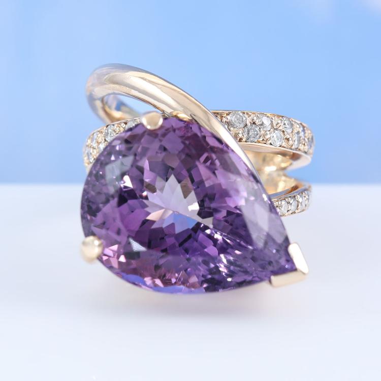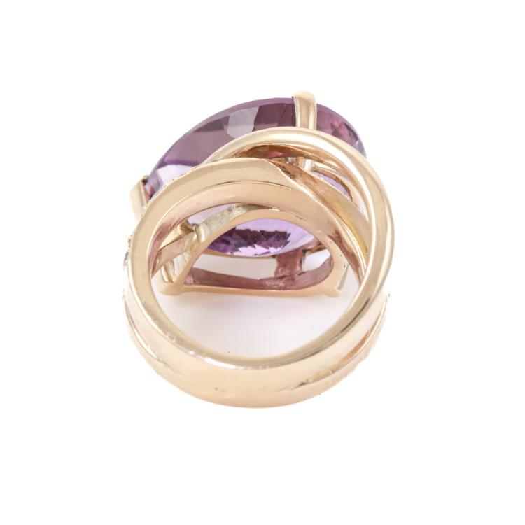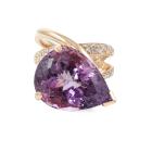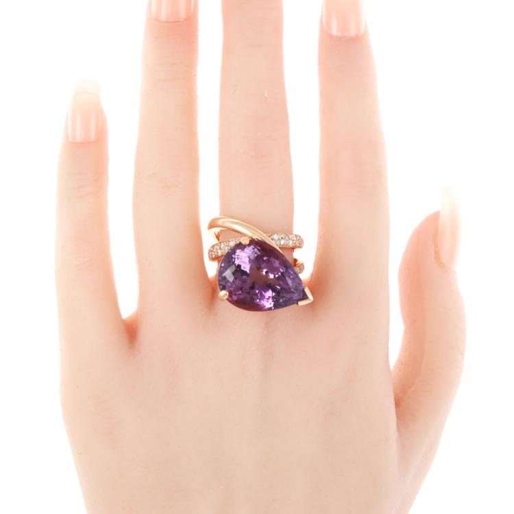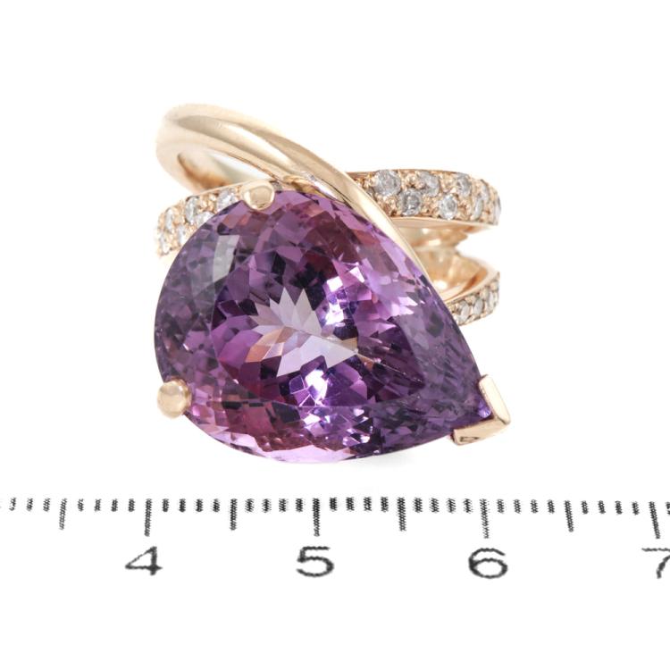 Amethyst and Diamond ring with a pear shape Natural Amethyst of approximately 21.00ct and round Natural Diamonds totalling approximately 0.35ct (Estimated grading: H-I SI-P1). 9ct rose gold. Ring size N. Band width: 6mm. Weight: 17.1g. (Pre-owned)
