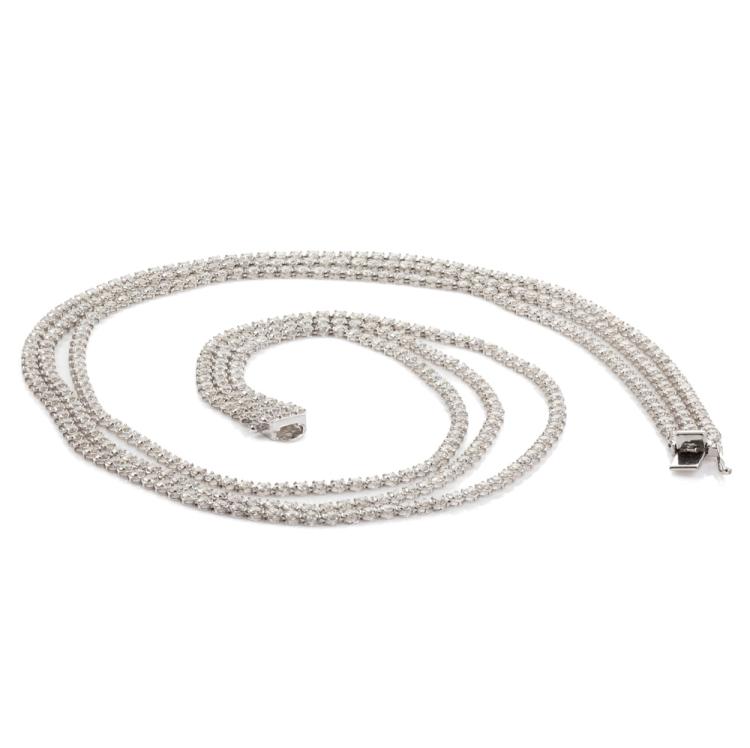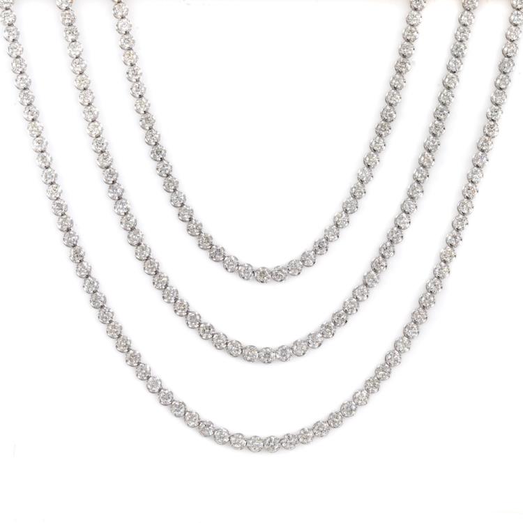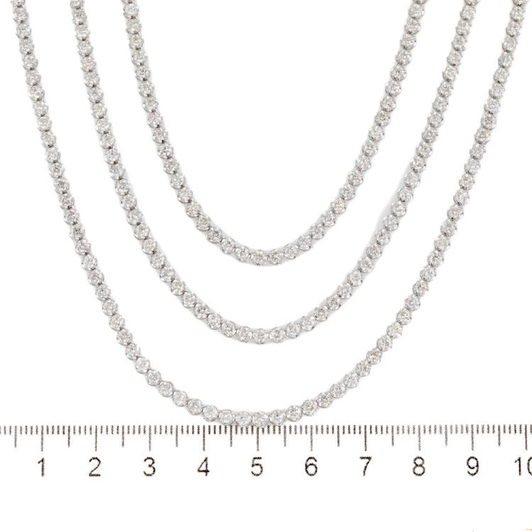 Diamond three row tennis necklace with 432 round Natural Diamonds totalling 21.00cts (Estimated grading: H-I SI). 14ct white gold. Length: 40.0cm. Weight: 21.7g. With Certificate #418177. (New)