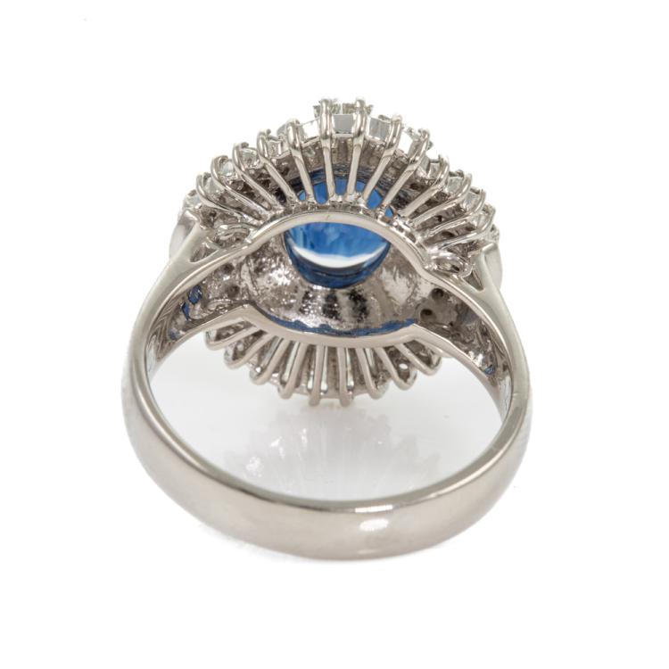 Sapphire and Diamond ring with an oval shape blue Natural Sapphire of 2.14ct and round & baguette cut Natural Diamonds totalling 0.81cts (Estimated grading: G-H SI-P1). Platinum 900. Ring size M. Band width: 3.2mm-4.5mm. Weight: 10.0g. (Pre-owned)