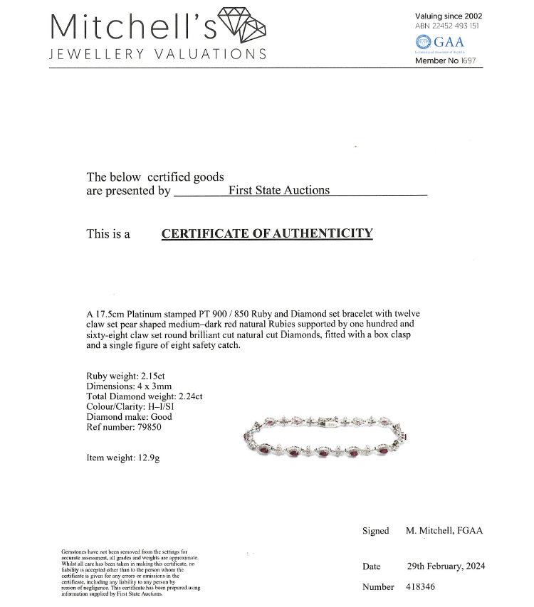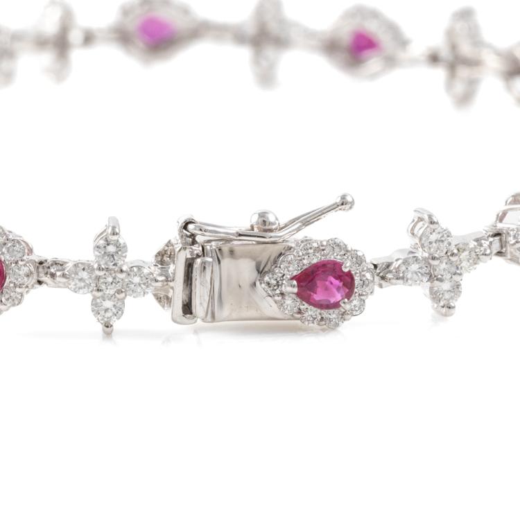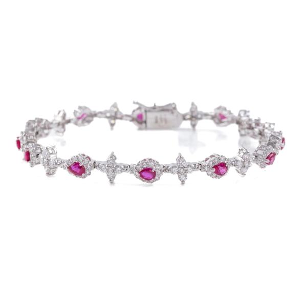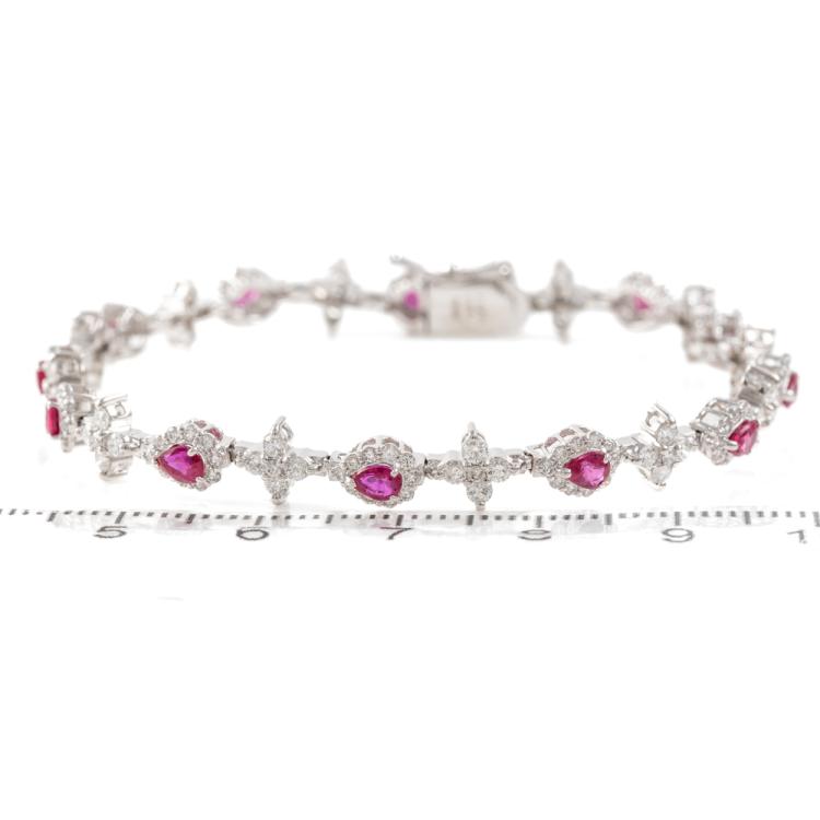 Ruby and Diamond bracelet with pear shape Natural Rubies totalling 2.15ct and round Natural Diamonds totalling 2.24ct (Estimated grading: H-I SI). Platinum 900 and 850. Length: 17.5cm. Weight: 12.9g. With Certificate #418346. (Pre-owned)