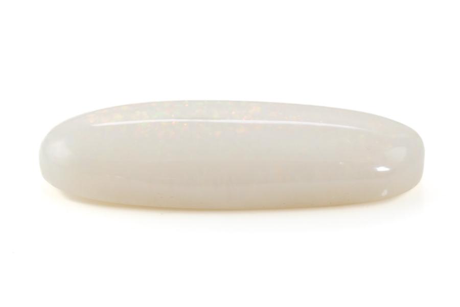 A loose cabochon cut oval solid white Opal of 27.82ct. Dimensions 41.0x14.7x8.6 mm. (As New)^