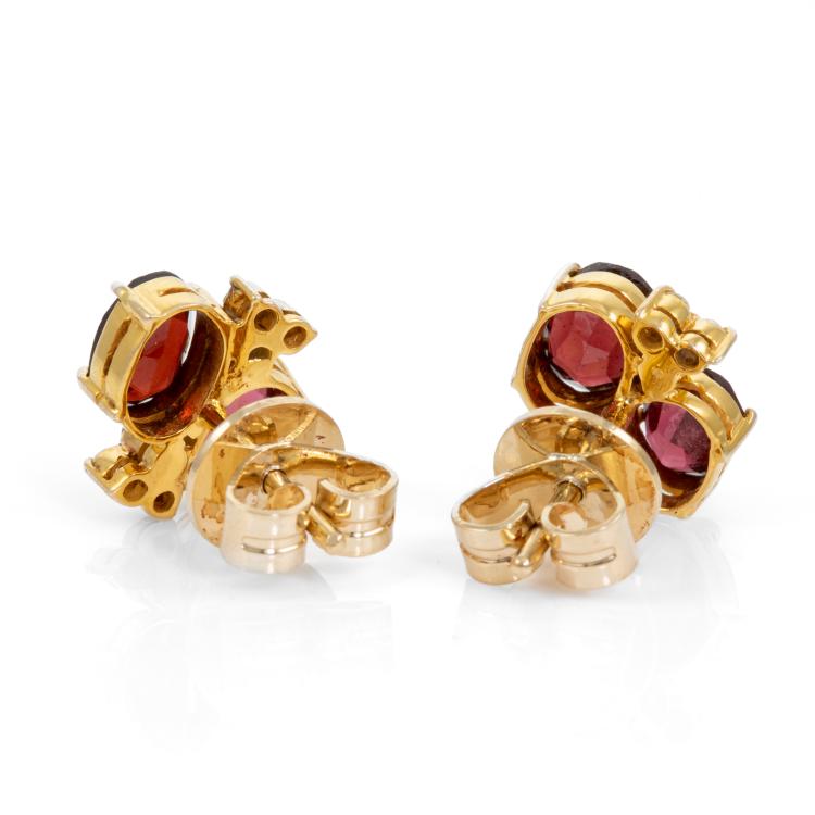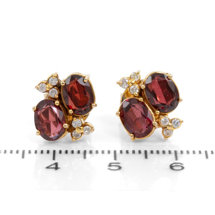 Garnet and Diamond earrings with 4 oval shape natural red Garnet totalling approximately 2.80cts and round natural Diamonds totalling approximately 0.24cts. 18ct yellow gold. Weight: 4.9g (Pre-owned)
