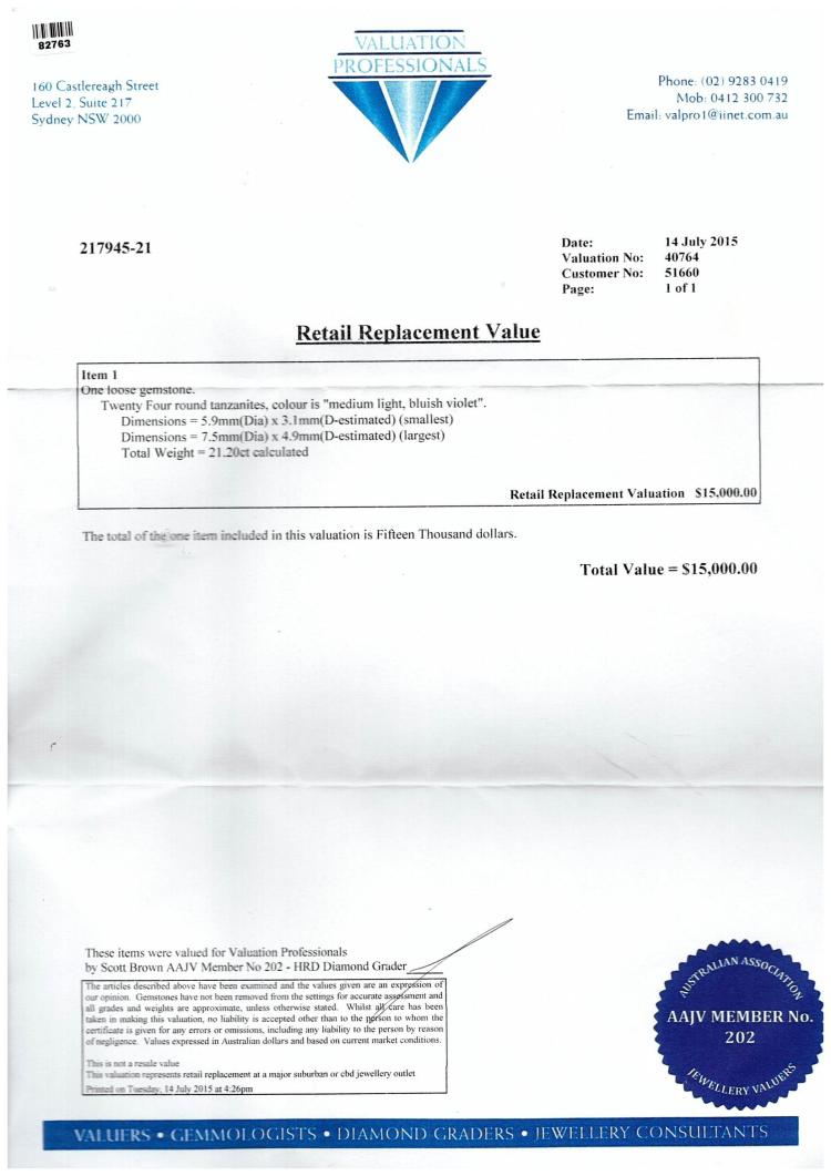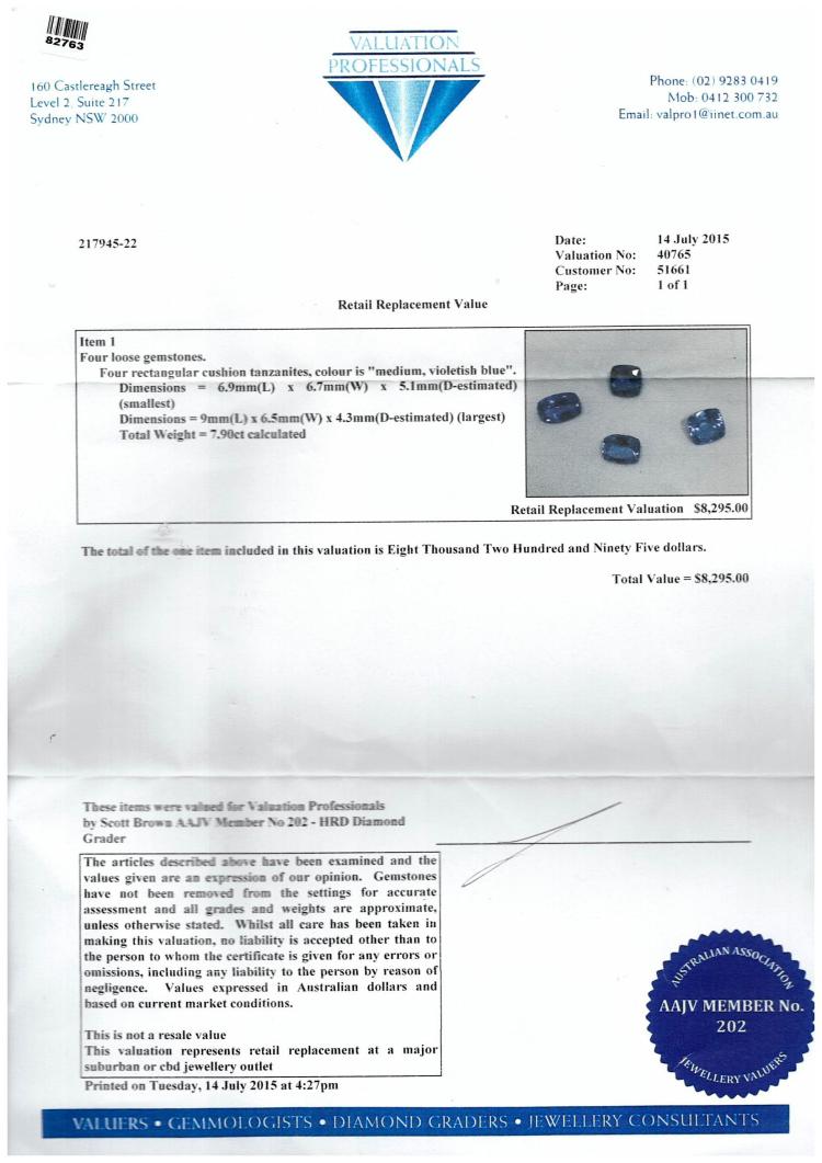 A Loose parcel of 24 round natural Tanzanites totalling 21.2ct and 4 cushion cut natural Tanzanites totalling 7.90ct. Size of round Tanzanites: 7.5 x 4.9mm - 5.9 x 3.1mm with Valuation Certificate #40764; size of cushion cut Tanzanites: 9.0 x 6.5 x 4.3mm - 6.9 x 6.7 x 5.1mm with Valuation Certificate #40765. (Pre-Owned)