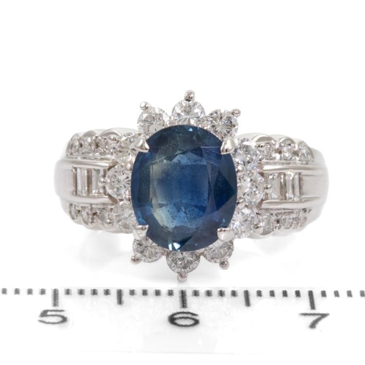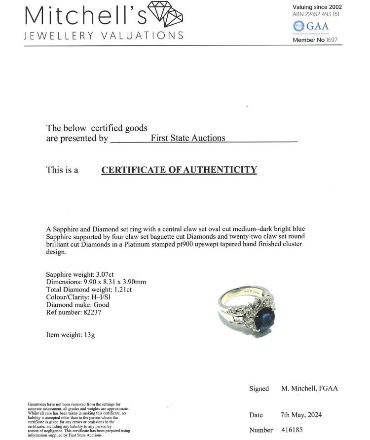Sapphire and Diamond ring with an oval shape natural blue Sapphire of 3.07ct and round & baguette cut natural Diamonds totalling 1.21ct (Estimated grading: H-I SI). Platinum 900. Ring size O. Band width: 3.8mm-8.5mm. Weight: 13.0g. With Certificate #416185. (Pre-owned)