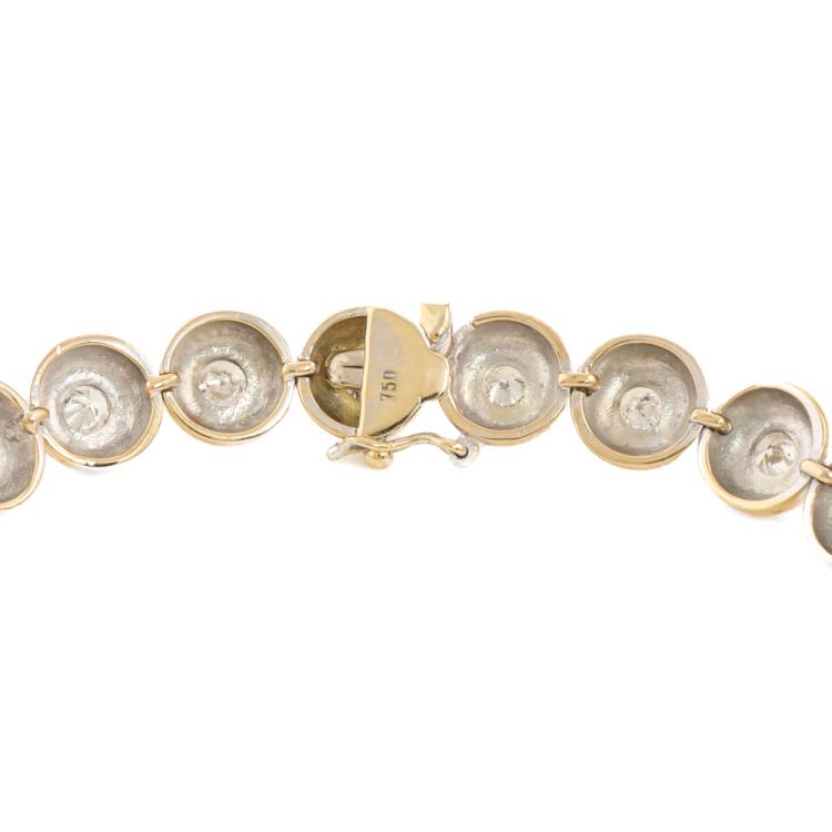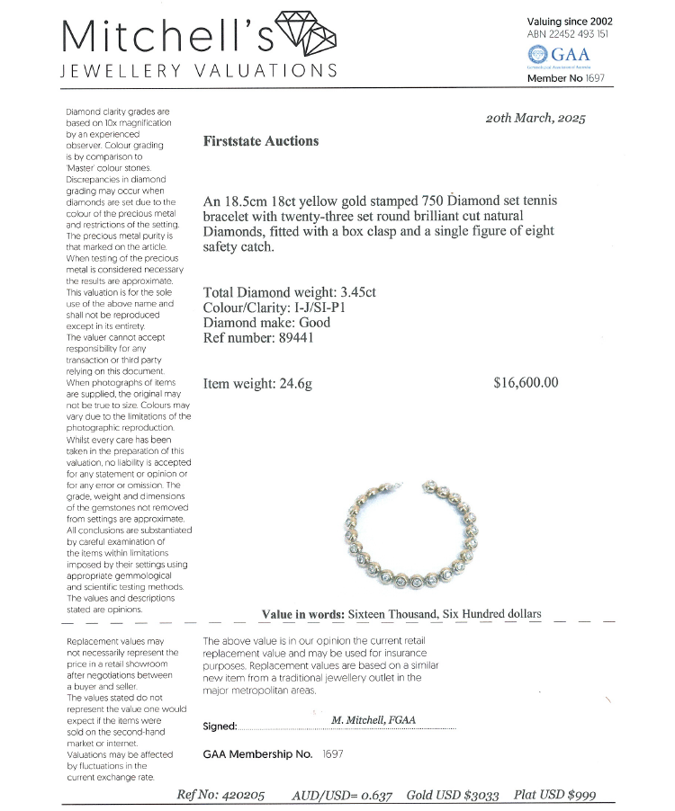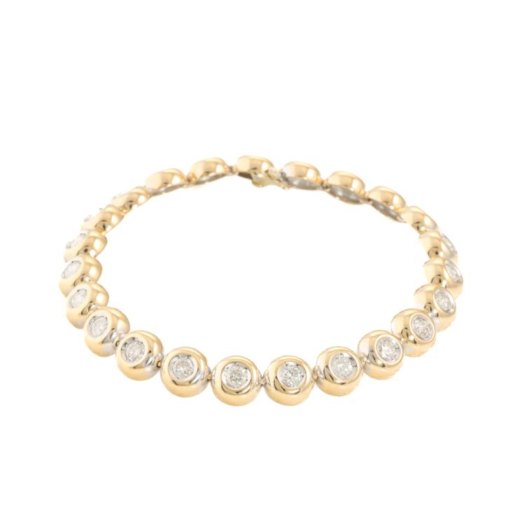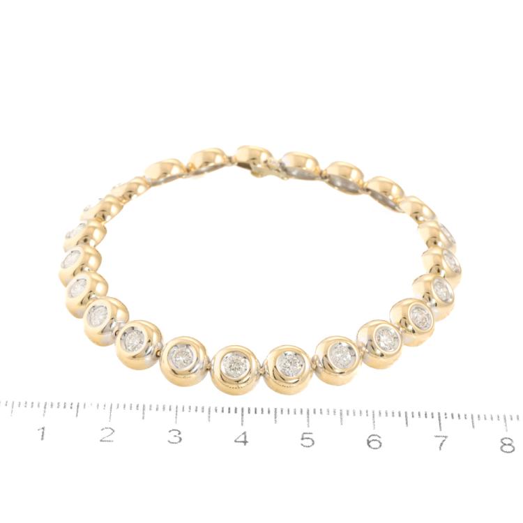 Diamond tennis bracelet with 23 bezel set round Natural Diamonds totalling approximately 3.45ct (Estimated grading: I-J SI-P1). 18ct yellow gold. Length: 18.5cm. Weight: 24.6g. With Valuation Certificate #420205. (Pre-owned)