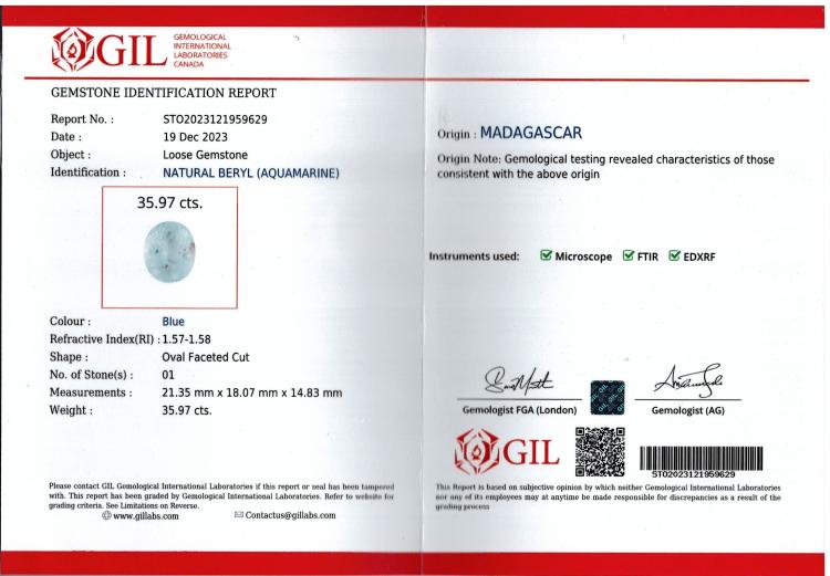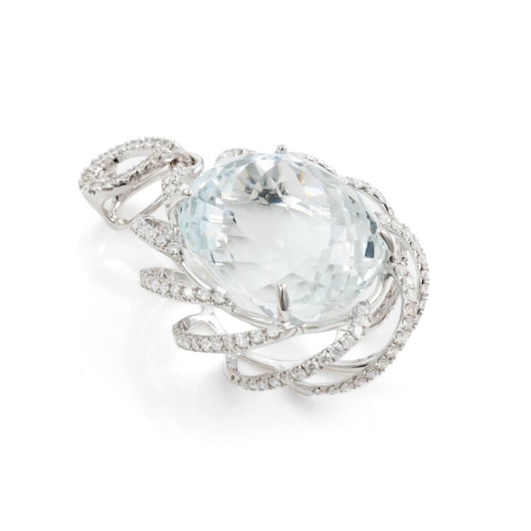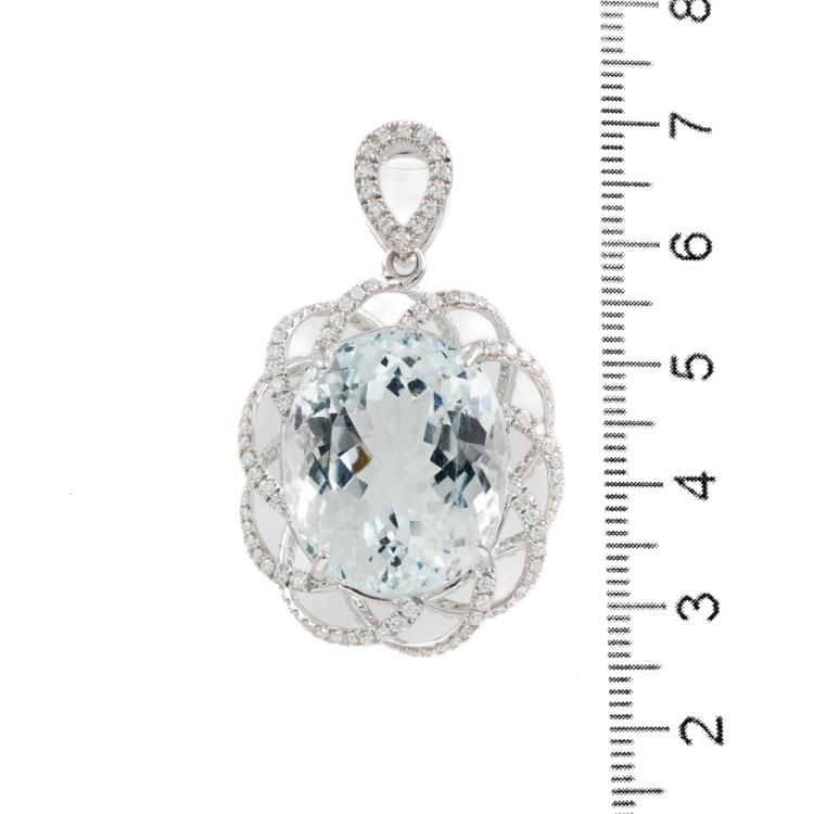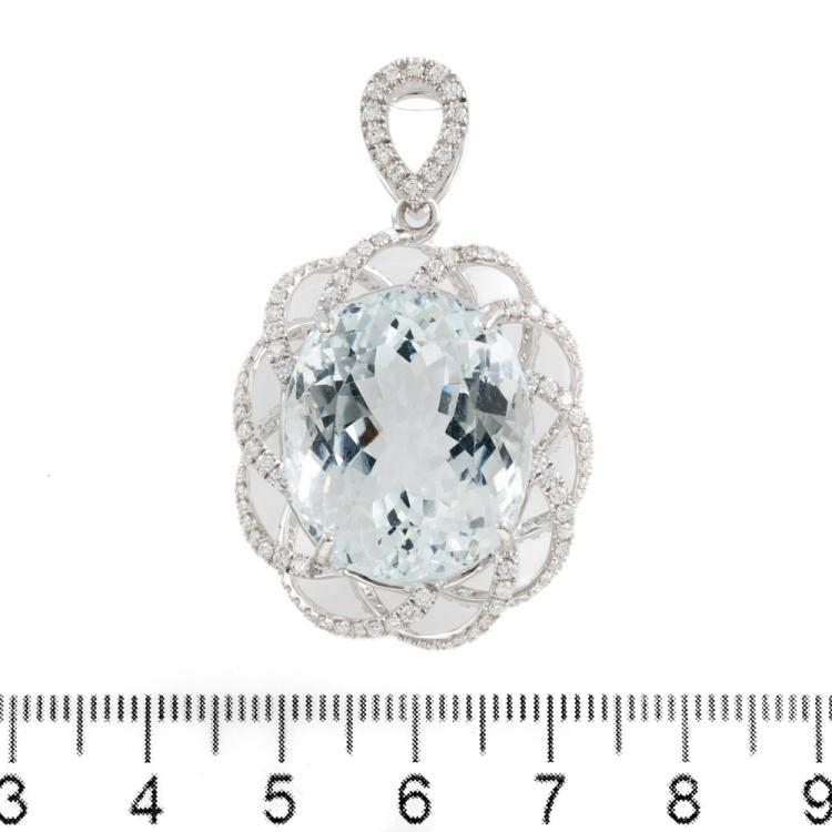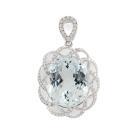 Aquamarine and Diamond pendant with oval shape natural Madagascan Aquamarine of 35.97ct and round natural Diamonds totalling approximately 0.70ct (Estimated grading: G-H SI). 18ct white gold. No chain provided. Weight: 13.5g. With GIL Report #STO2023121959629. (Pre-owned)