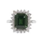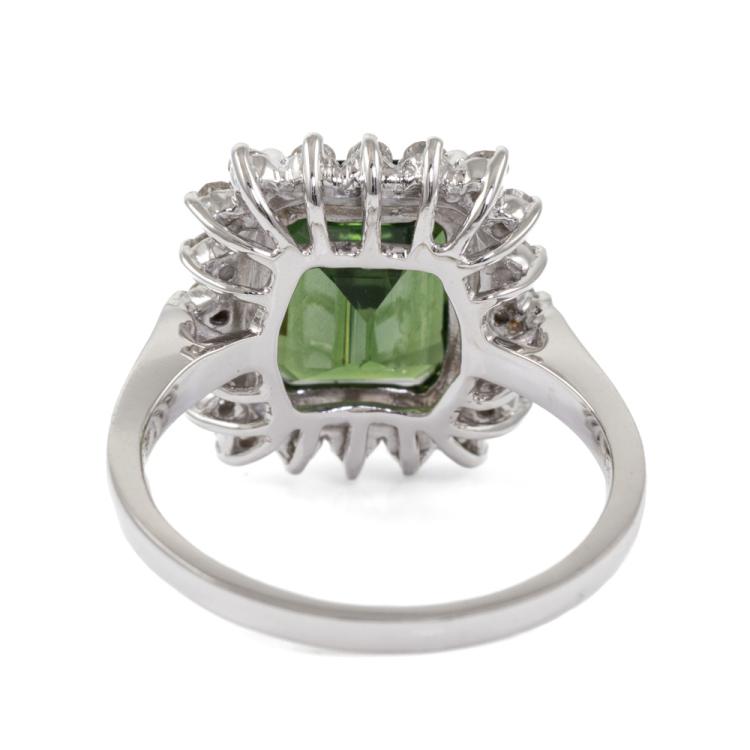 Sapphire and Diamond ring with emerald cut natural green Sapphire of 3.87ct and round natural Diamonds totalling 0.40ct (Estimated grading: G-H SI-P1). 14ct white gold. Ring size: K. Band width: 1.6mm. Weight: 4.2g. With Valuation #917162. (Pre-Owned)