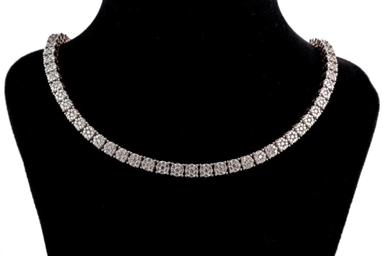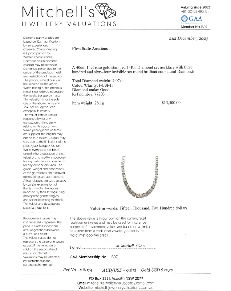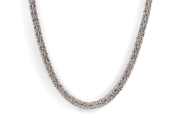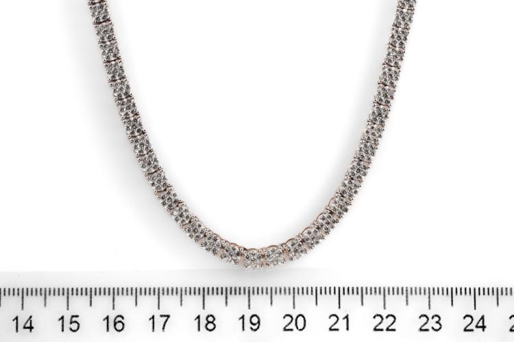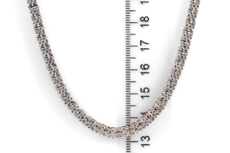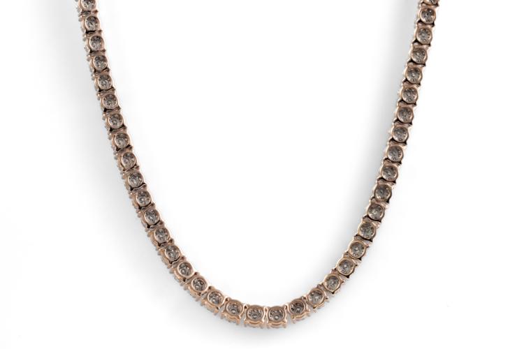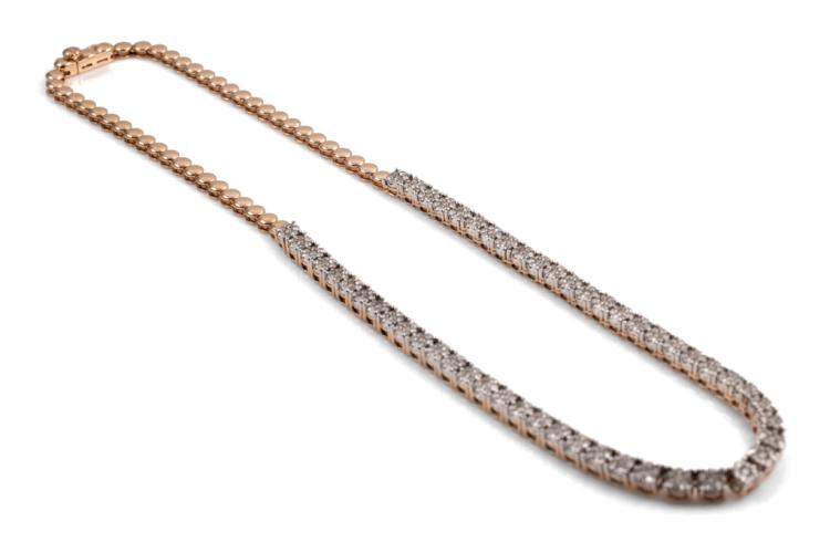 Diamond necklace with 364 round Natural Diamonds totalling 4.07cts (Estimated grading: I-J SI-P1), invisibly set, each link is set with 7 Diamonds. 14ct rose gold. Length: 40cm. Diamonds extend 22.7cm of the necklace. Weight: 28.1g. With Valuation Certificate #418074. (New)