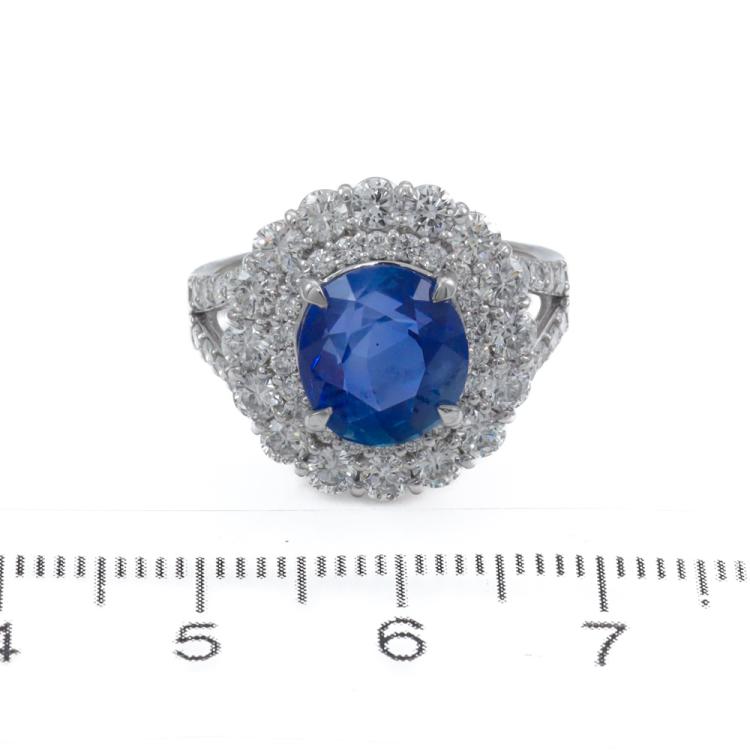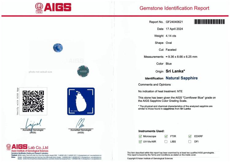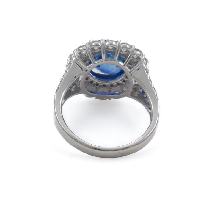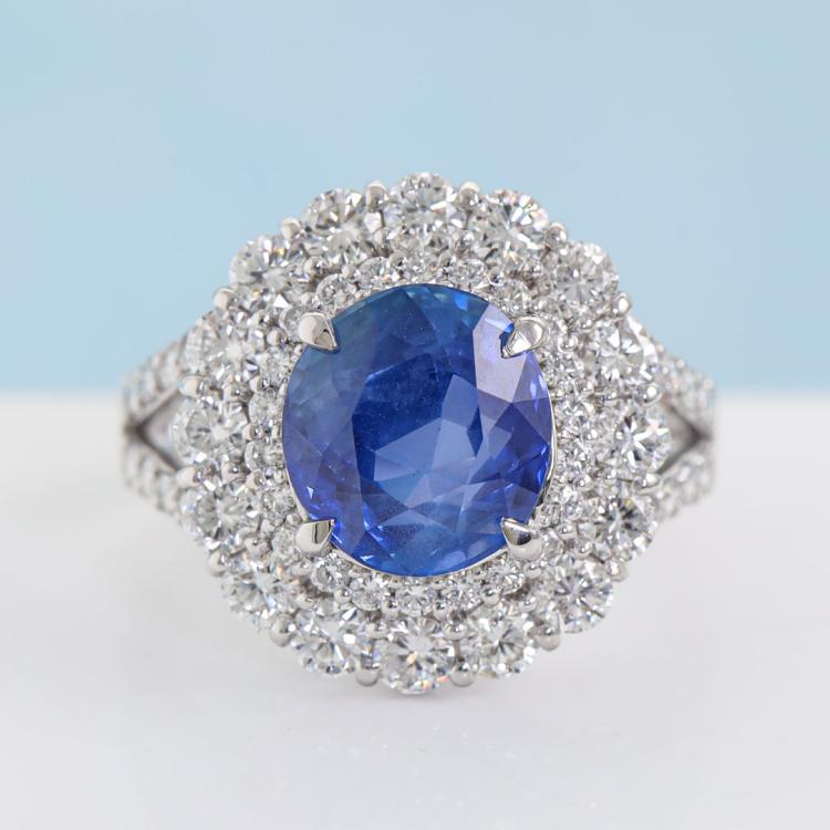 Sapphire and Diamond ring with oval shape unheated Cornflower Blue Sri Lanka Natural Sapphire of 4.14ct (with AIGS Certificate #GF24040621) and round Natural Diamonds totalling 1.57ct (Estimated grading: G VS). Platinum - 900. Ring size: L3/4. Band width: 2.5mm - 3.6mm. Weight: 8.6g. (Pre-owned)