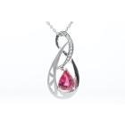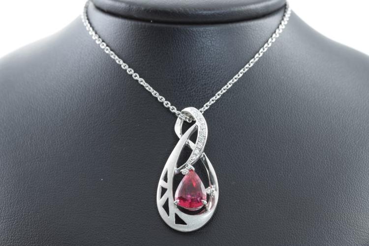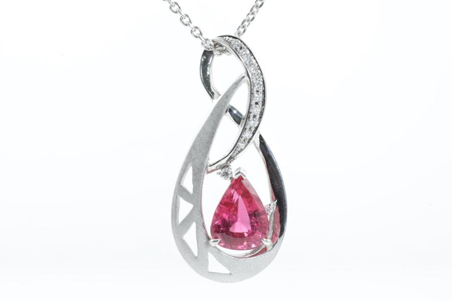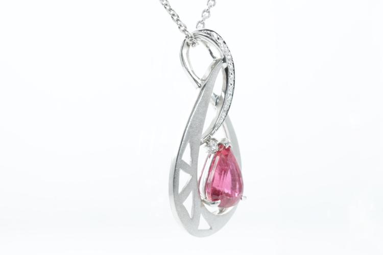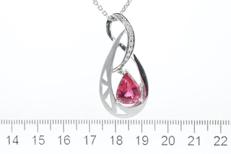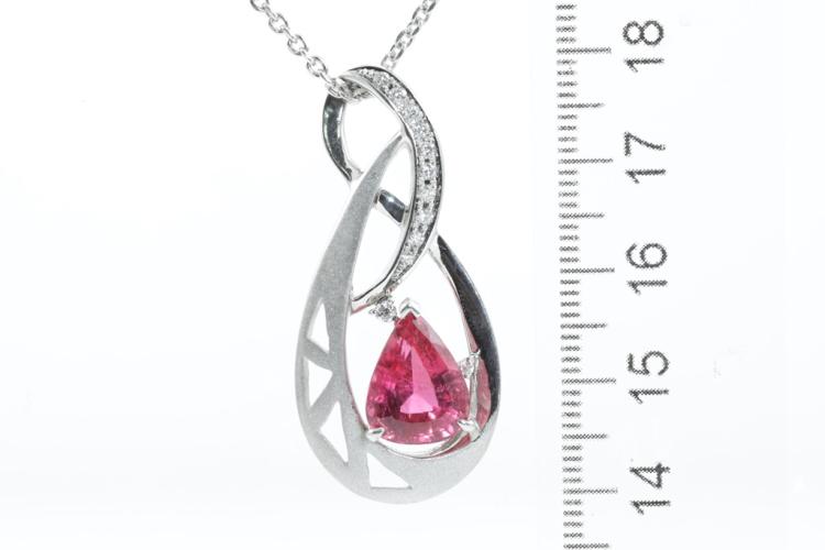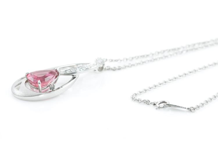 Tourmaline and Diamond pendant with pear shape pink natural Tourmaline of 4.50ct and round natural Diamonds totalling 0.19ct. Platinum-900 with 42cm platinum (stamped P.M) chain. Weight: 17.2g (Pre-owned)