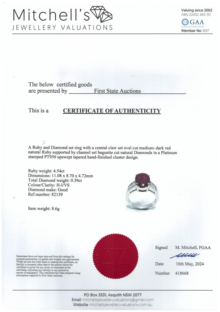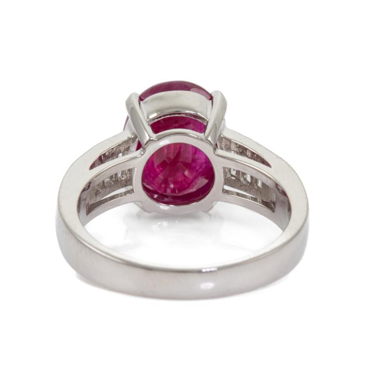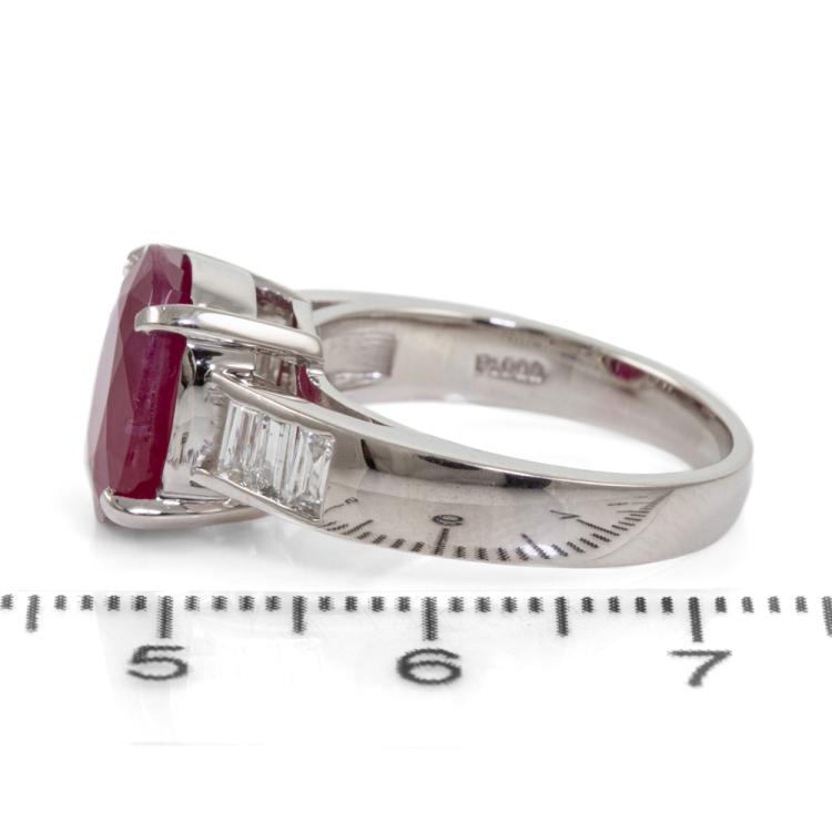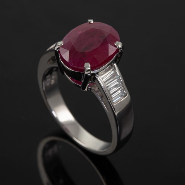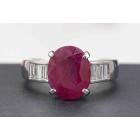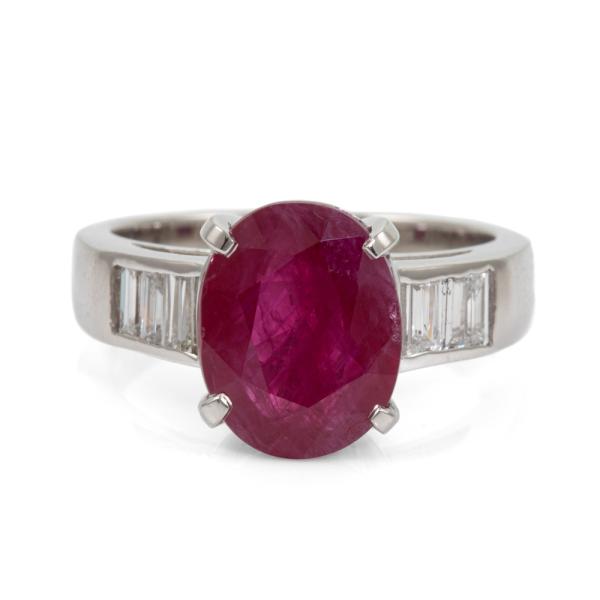 Ruby and Diamond ring with oval natural Ruby of 4.54ct and baguette cut natural Diamonds totalling 0.39ct (Estimated grading: H-I VS). Platinum-900. Ring size: M. Band width: 2.9mm - 4.4mm. Weight: 8.6g. With Certificate 418668. (Pre-owned)