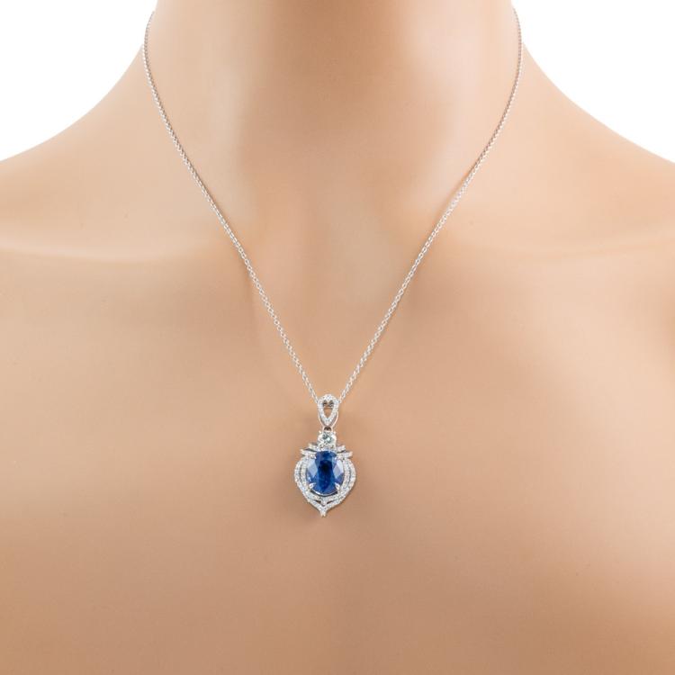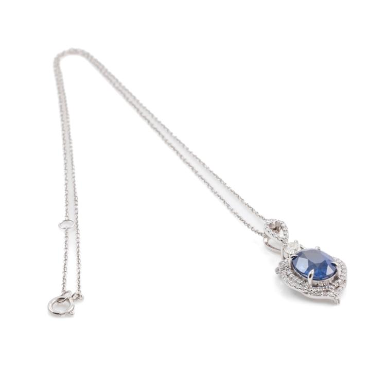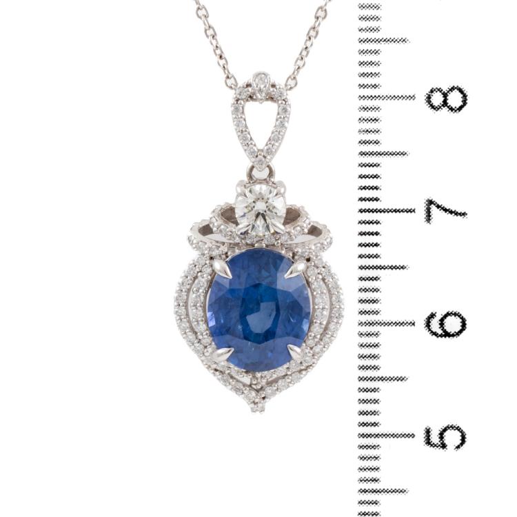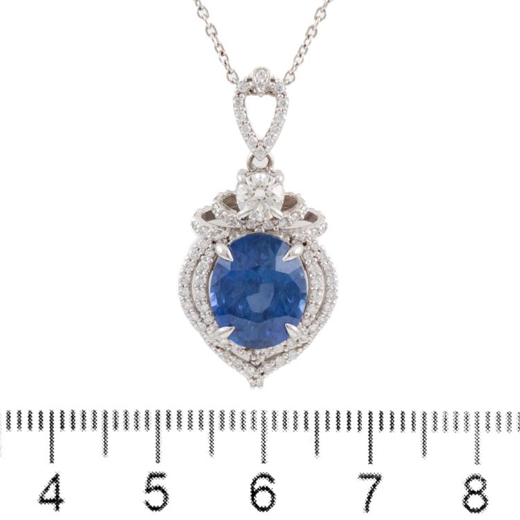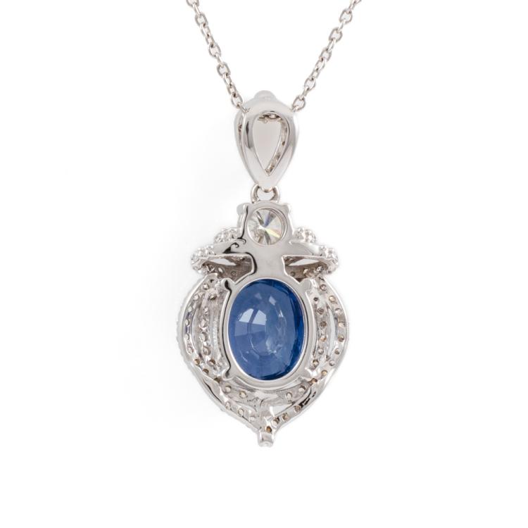Sapphire and Diamond pendant with oval shape natural Ceylon blue Sapphire of 4.75ct (With GIA Report #5473128946) and round natural Diamonds totalling approximately 0.65ct (Estimated grading: G VS-SI). 18ct white gold with 45cm 18ct white gold adjustable chain. Weight: 6.7g. (Pre-owned)